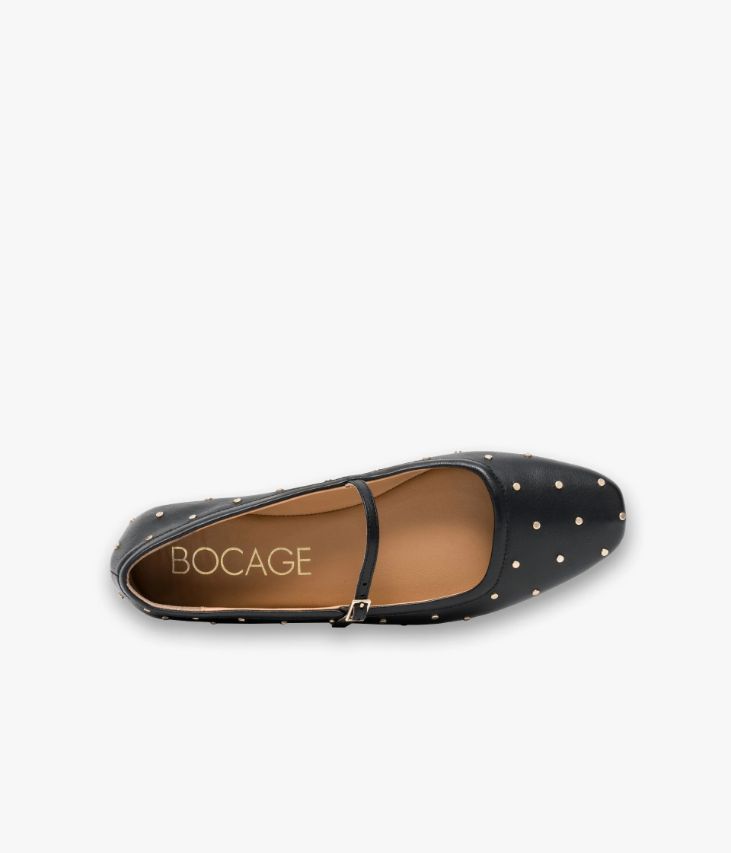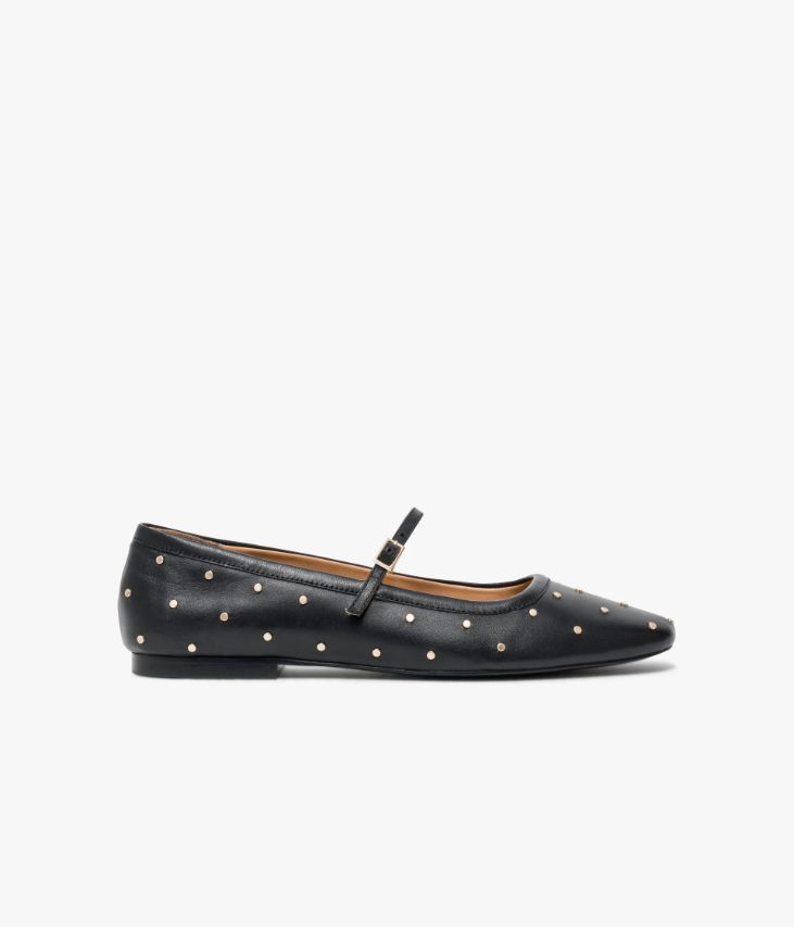 Une ballerine en cuir noir fabriquée avec le plus grand soin. Parsemée de petits clous dorés, elle illumine les looks tout en ajoutant une délicate touche rétro. Elle affiche une ligne contemporaine avec bout carré et large décolleté. Cette ballerine possède une fine bride sur le dessus du pied fermée par une boucle rectangle dissimulant un élastique. Cette chaussure est conçue selon la méthode de fabrication Sacchetto : le cuir souple de la doublure est cousu comme un petit sac puis intégré dans la tige, il enrobe ainsi le pied comme un gant. Elle repose sur une semelle fine et un talon extra plat.