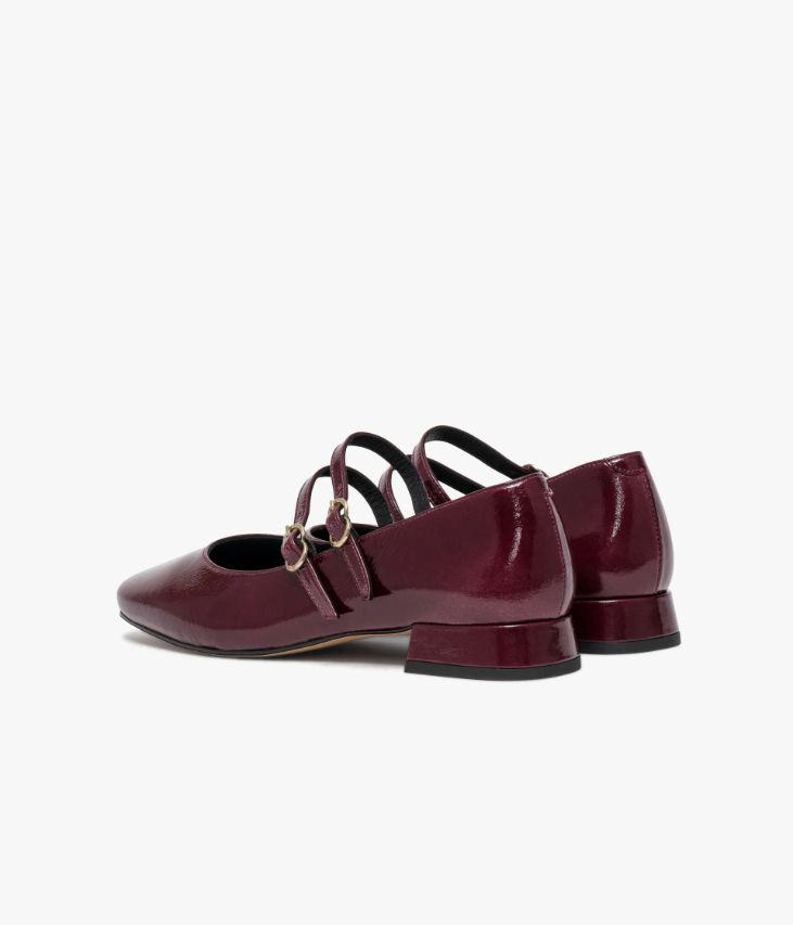 Une ballerine en cuir verni lie-de-vin fabriquée avec soin au Portugal. Elle séduit par ses courbes harmonieuses, son bout arrondi et ses fines brides sur le cou-de-pied fermées par de jolies boucles dorées. Cette ballerine femme repose sur un petit talon confortable enrobé de cuir. Une chaussure entièrement doublée cuir avec semelle intérieure cuir dotée d’une fine mousse. Elastiques d’aisance sous les boucles. Ce cuir Naplak particulièrement souple peut présenter un aspect légèrement froissé. Elastiques d’aisance sous les boucles.