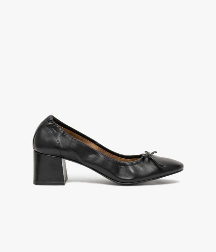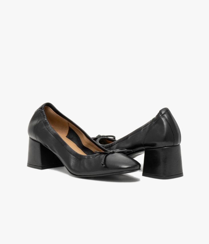 Une ballerine en cuir noir fabriquée avec soin au Portugal. Un intemporel revisité avec un élégant talon bloc. Cette chaussure conserve les codes emblématiques de la ballerine avec son bout arrondi, son col élastiqué assurant un bon maintien et son petit nœud sur le dessus. Une chaussure non doublée pour une sensation seconde peau, avec semelle intérieure cuir intégrant une fine couche de mousse.