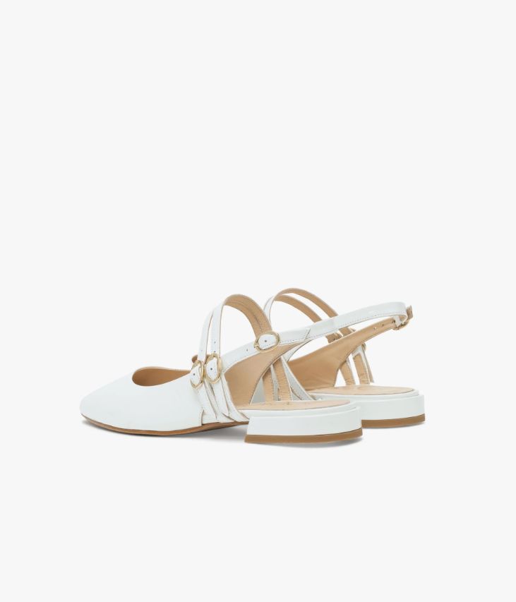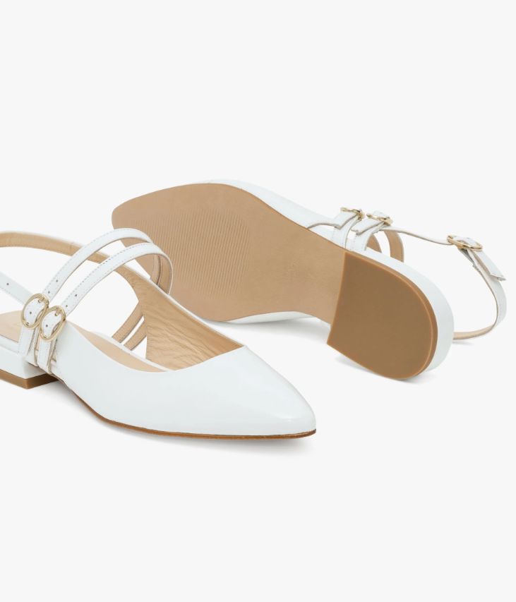 Une ballerine à bride arrière en cuir verni blanc fabriquée avec soin au Portugal. Un modèle élégant à bout pointu, agrémenté de deux fines brides sur le cou-de-pied, ajustables par de jolies boucles dorées. Une chaussure entièrement doublée cuir avec semelle intérieure cuir dotée d’une fine mousse. Elle repose sur une semelle fine avec petit talon flare enrobé de cuir. Ce cuir Naplak particulièrement souple peut présenter un aspect légèrement froissé.