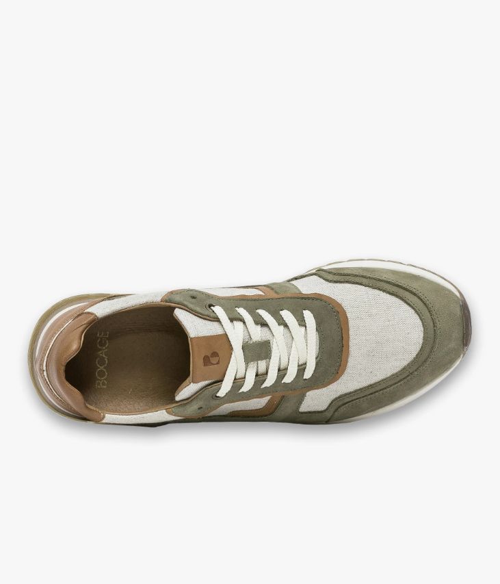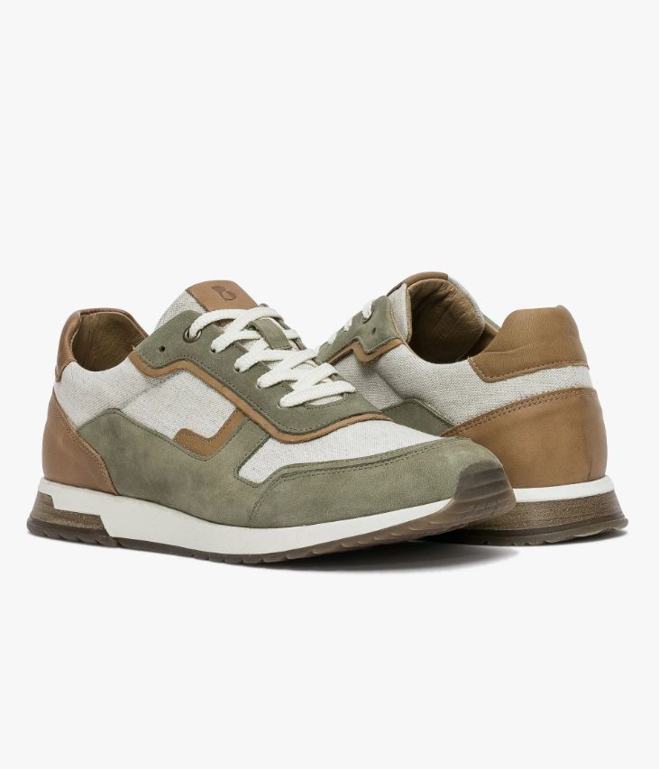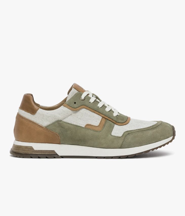 Une basket vert kaki, beige et camel fabriquée avec soin au Portugal dans un mélange de cuir lisse, de nubuck et de coton. Une basket homme entièrement doublée cuir avec semelle intérieure cuir moussée très confortable et amovible. Elle se ferme grâce à des lacets plats et repose sur une semelle blanche avec insert aspect lamellé collé au talon. Col et languette rembourrés pour plus de confort.