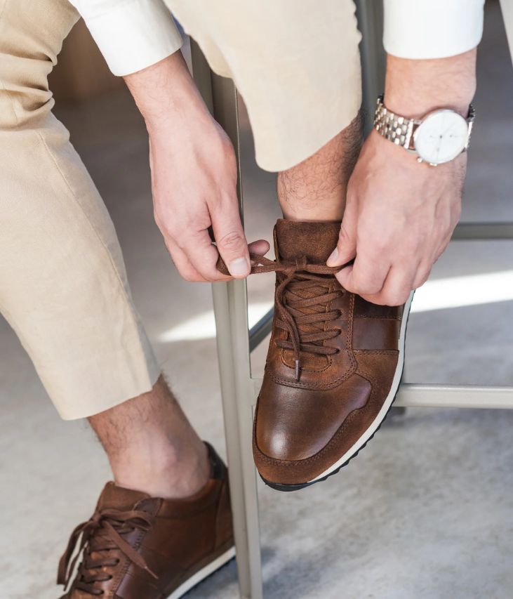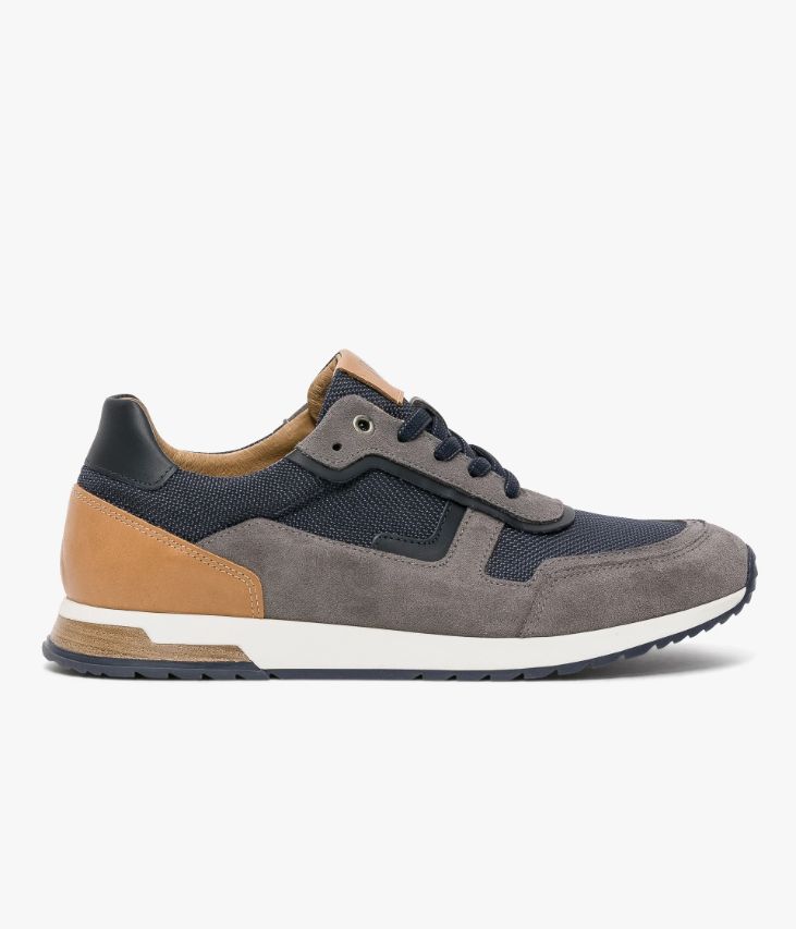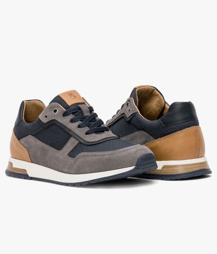 Une basket marine et gris fabriquée avec soin au Portugal dans un mélange de cuir lisse, de cuir velours et de toile nylon. Elle est rehaussée d’un empiècement camel au talon et d’un patch assorti sur la languette. Une basket homme entièrement doublée cuir avec semelle intérieure cuir amovible moussée très confortable. Elle se ferme grâce à des lacets plats et repose sur une semelle blanche avec insert aspect lamellé collé au talon. Col et languette rembourrés pour plus de confort.