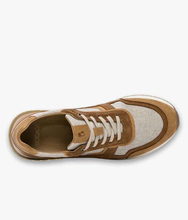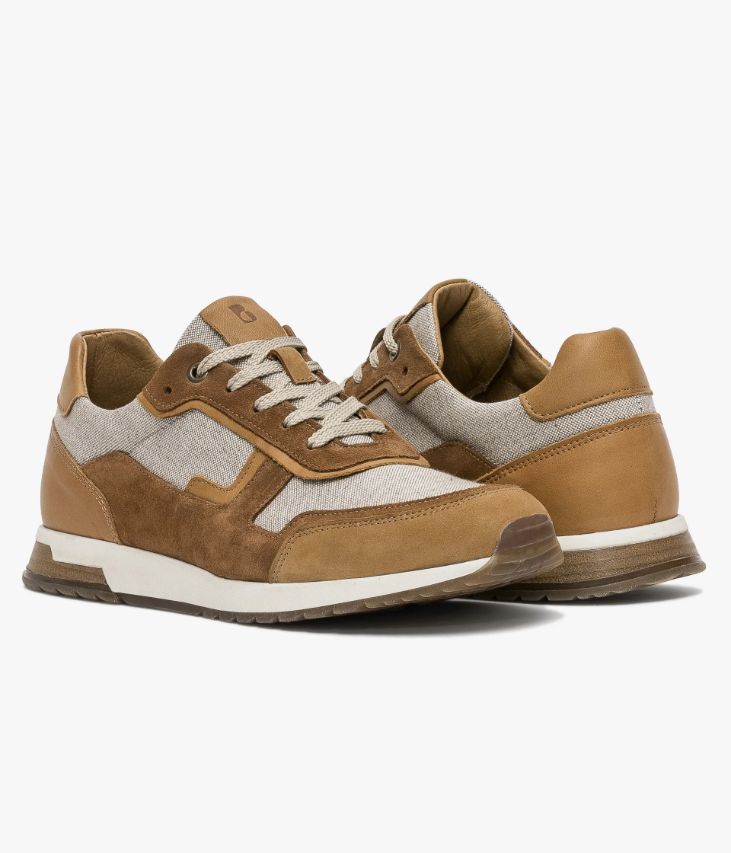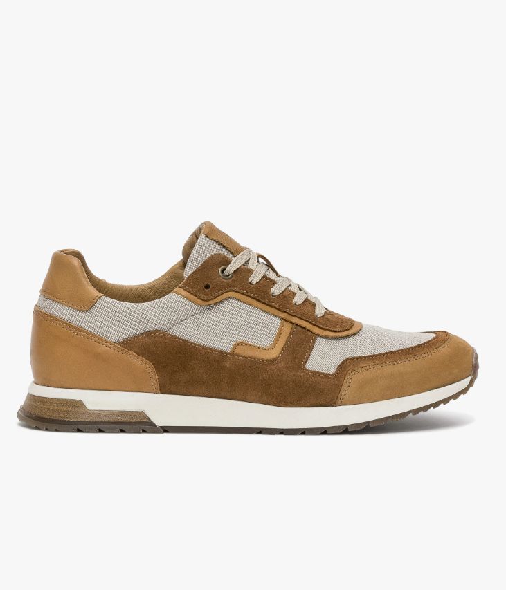 Une basket cognac et beige fabriquée avec soin au Portugal dans un mélange de cuir lisse, de cuir velours et de coton. Une basket homme entièrement doublée cuir avec semelle intérieure cuir amovible moussée très confortable. Elle se ferme grâce à des lacets plats et repose sur une semelle blanche avec patch aspect lamellé collé au talon. Col et languette rembourrés pour plus de confort.