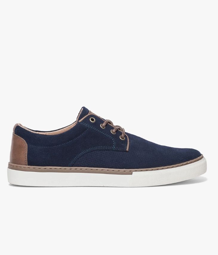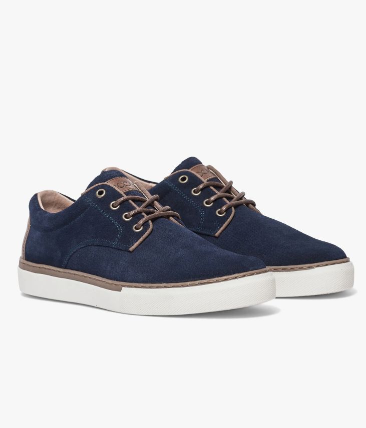 Basket marine en cuir velours avec semelle en caoutchouc blanc. Une version élégante de la basket de ville qui flirte avec la ligne du derby. Cette basket marine en cuir velours possède un aspect perforé sur l’avant du pied et de jolies surpiqûres sur les quartiers. Elle est agrémentée d’une pièce de cuir lisse cognac au talon et d’une autre avec logo embossé sur la languette. Cette basket homme est positionnée sur une semelle en caoutchouc blanc, avec trépointe beige, qui lui assure un look dynamique. La tige et la semelle sont renforcées grâce au cousu latéral. Ce cousu est un gage de qualité quant à sa fabrication et à sa durabilité. Une basket entièrement doublée cuir avec semelle intérieure cuir. Elle s’intègre dans tous les looks casual chics de la saison.