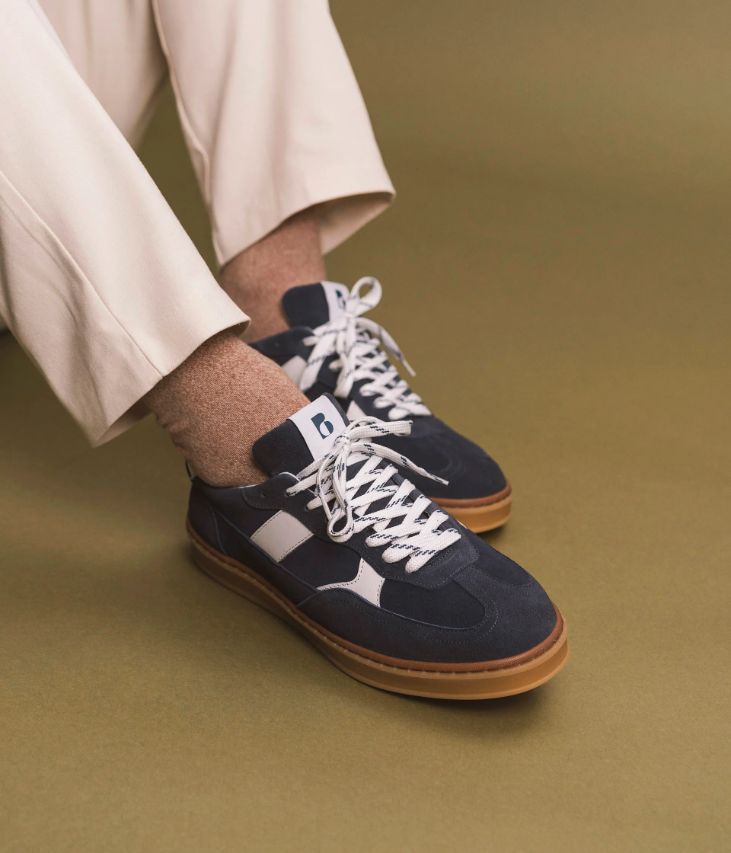 Une basket en cuir marine fabriquée avec soin au Portugal. Une running formelle à porter avec un jean comme avec un pantalon chino ou un pantalon de costume. Elle se distingue par ses empiècements et ses perforations qui lui confèrent une allure sportive, accentuée par une semelle blanche et miel finement crantée qui remonte vers le talon. Le cuir Crust est un cuir à tannage végétal qui est ensuite teinté à plusieurs reprises sur forme pour donner cet effet de patine si particulier, qui va évoluer au fil du temps au fil des entretiens réguliers. Une basket entièrement doublée cuir avec semelle intérieure cuir moussée amovible. Languette et col moussés pour plus de confort.
