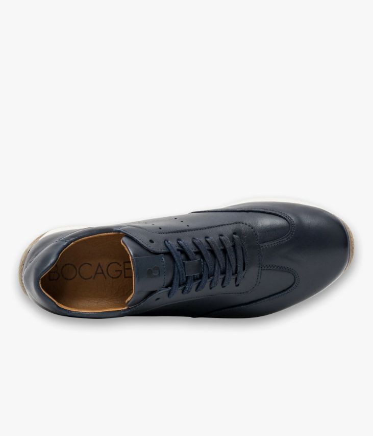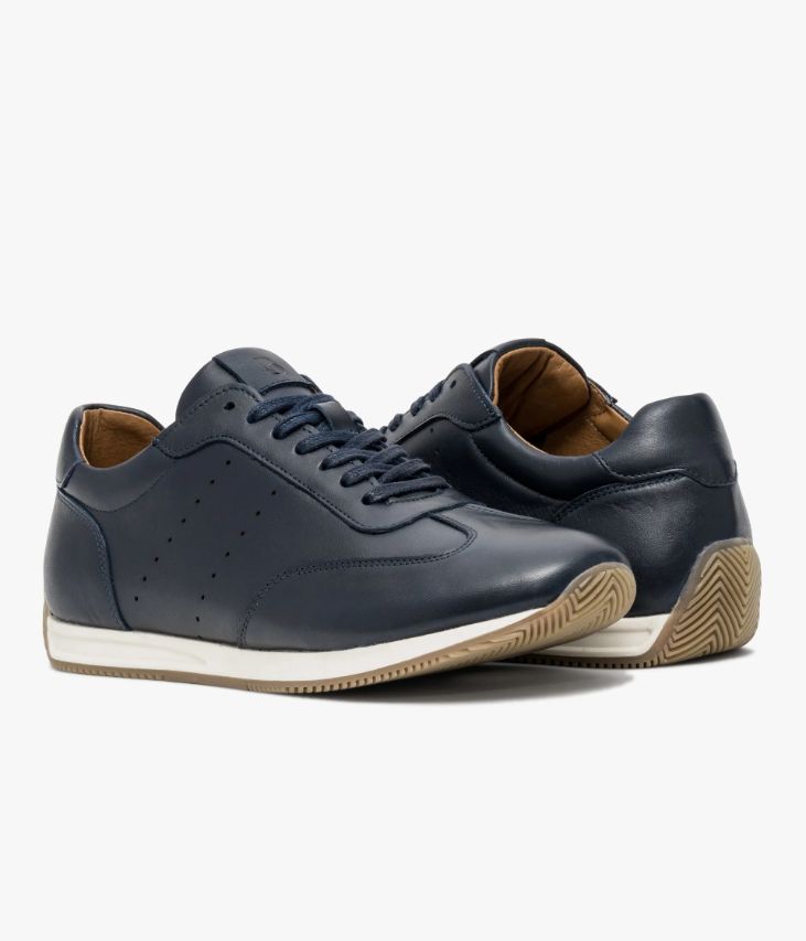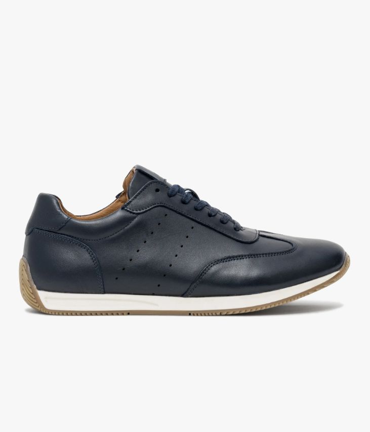 Une basket en cuir marine fabriquée avec soin au Portugal. Une running formelle à porter avec un jean comme avec un pantalon chino ou un pantalon de costume. Elle se distingue par ses empiècements et ses perforations qui lui confèrent une allure sportive, accentuée par une semelle blanche et miel finement crantée qui remonte vers le talon. Le cuir Crust est un cuir à tannage végétal qui est ensuite teinté à plusieurs reprises sur forme pour donner cet effet de patine si particulier, qui va évoluer au fil du temps au fil des entretiens réguliers. Une basket entièrement doublée cuir avec semelle intérieure cuir moussée amovible. Languette et col moussés pour plus de confort.