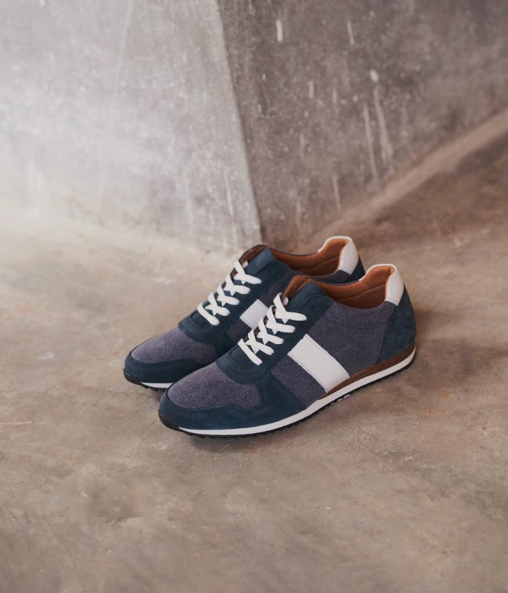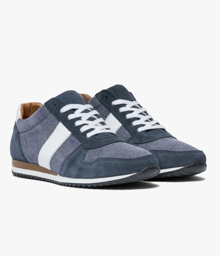 Basket bleue et blanche en toile et cuir. Une basket bleue confortable et stylée avec son dessus en toile canvas et son bout amande. Elle possède des empiècements en cuir velours bleu sur le bout du pied, sur la languette et au niveau du talon. A l'arrière du pied et sur les côtés, une pièce de cuir blanc vient apporter du relief et du dynamisme à la chaussure. Une basket doublée cuir avec semelle intérieure cuir amovible. Elle est montée sur une fine semelle bicolore en caoutchouc avec semelle extérieure crantée. Une basket décontractée à porter avec un pantalon blanc et un polo bleu.