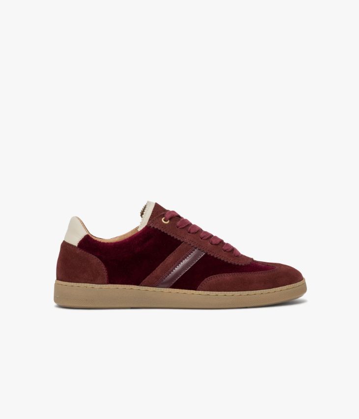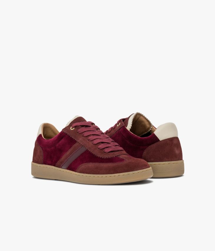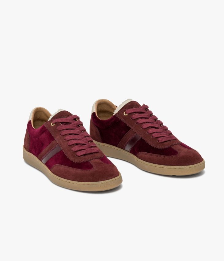 Une basket lie-de-vin fabriquée avec soin au Portugal dans un mélange de textile velours et de cuir velours. Une basket féminine ponctuée de touches de cuir lisse écru et lie-de-vin, fermée par des lacets plats. Une sneaker non doublée pour un effet seconde peau, dotée d'une semelle intérieure en cuir amovible ultra confortable. Elle repose sur une semelle en caoutchouc couleur miel. Cette paire bénéficie du montage Strobel et d’une semelle renforcée par un cousu latéral, gage de qualité, apportant souplesse, robustesse et durabilité. Col et languette rembourrés pour plus de confort.