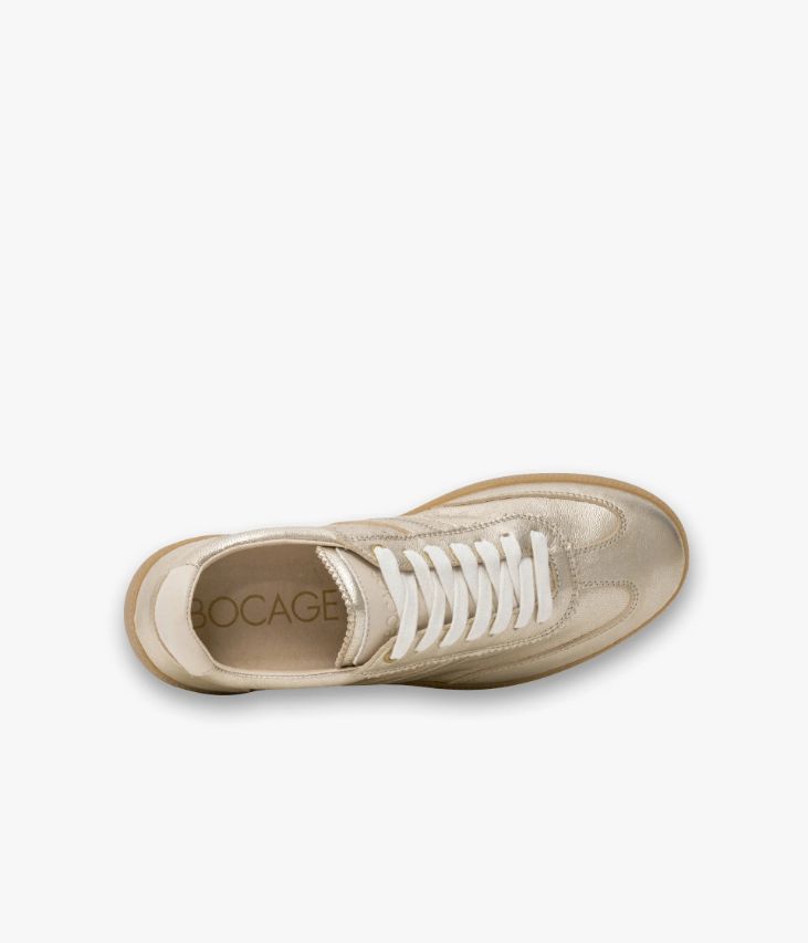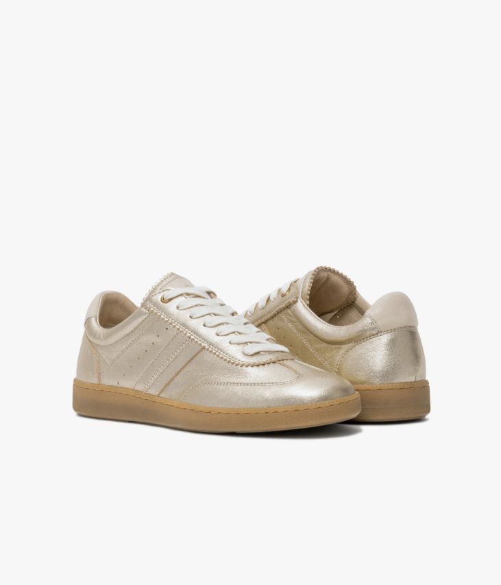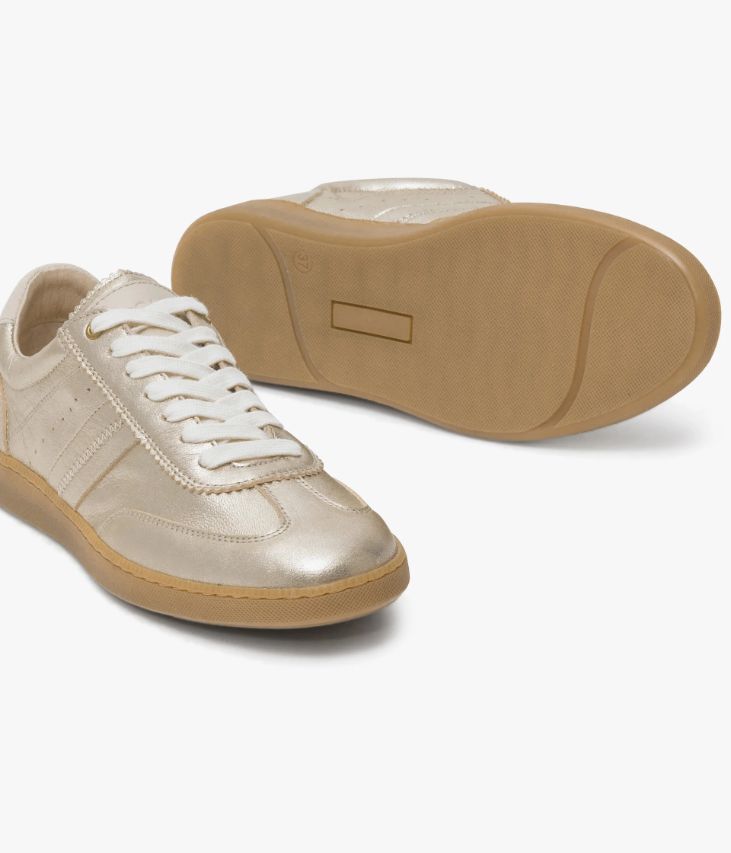 Une basket en cuir métallisé platine fabriquée avec soin au Portugal. Un modèle féminin ponctué de touches de cuir lisse écru sur la languette et au talon, fermée par des lacets plats. Une sneaker non doublée pour un effet seconde peau, dotée d'une semelle intérieure en cuir amovible ultra confortable. Elle repose sur une semelle en caoutchouc couleur miel. Cette paire bénéficie du montage Strobel et d’une semelle renforcée par un cousu latéral, gage de qualité, apportant souplesse, robustesse et durabilité. Col et languette rembourrés pour plus de confort.
