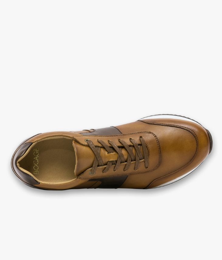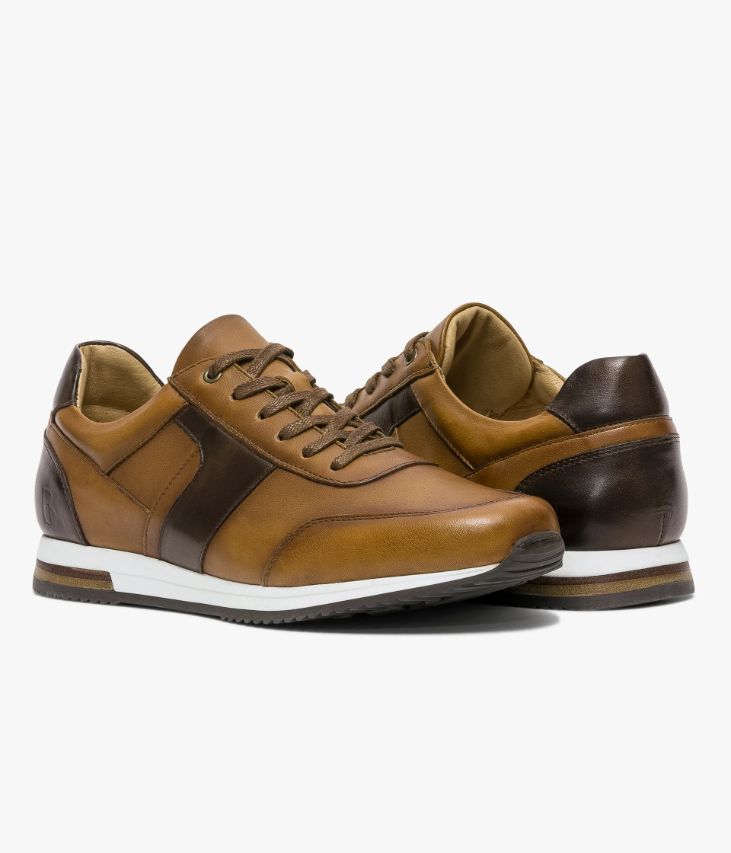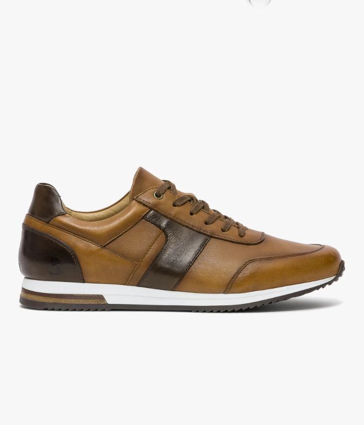 Une basket cognac en cuir lisse fabriquée avec soin au Portugal. Cette basket de ville doit son élégance à son alliance de cuir patiné cognac affichant un bel effet ombré et de cuir marron. Une chaussure entièrement doublée cuir avec semelle intérieure cuir amovible dotée d’une fine mousse. Elle repose sur une semelle blanche avec insert en cuir au talon. Col et languette rembourrés pour plus de confort.