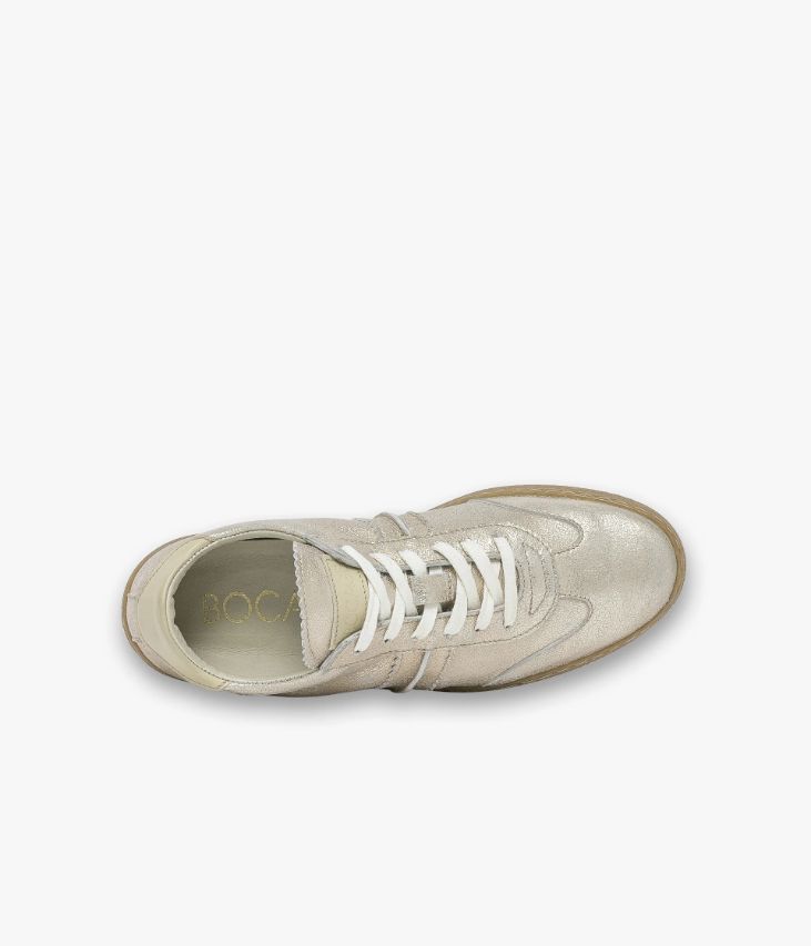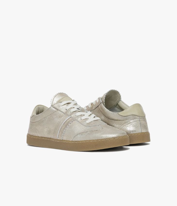 Une basket platine en cuir métallisé effet craquelé fabriquée avec soin au Portugal. Une basket très confortable réalisée dans un cuir ultra souple non doublé pour une sensation seconde peau. Elle est twistée par des touches de cuir lisse beige au talon et sur la languette. Cette basket femme possède une semelle intérieure cuir amovible dotée d’une mousse recyclée très confortable. Cette paire bénéficie du montage Strobel qui consiste à coudre directement la tige à la première de montage lors de la piqûre. Cette technique apporte une réelle robustesse et de la souplesse. La tige et la semelle sont renforcées grâce au cousu latéral, gage de qualité et de durabilité.