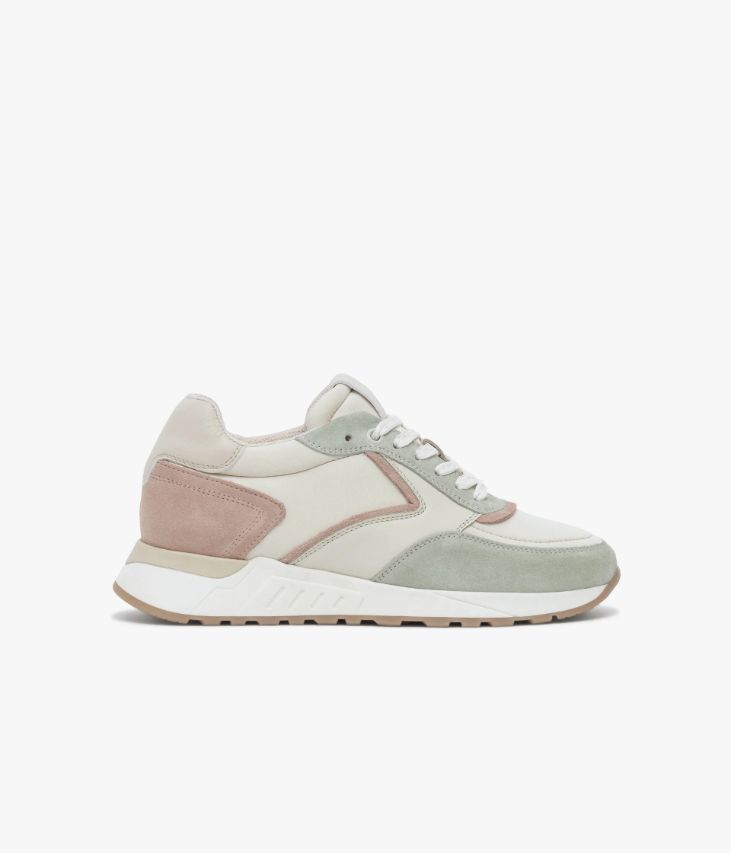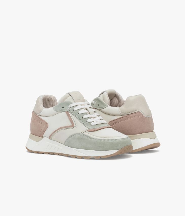 Une basket écru et vert fabriquée avec soin au Portugal. Cette basket en toile est rehaussée d’empiècements en cuir lisse ton sur ton et de touches de cuir velours vert d’eau et rose pâle. Cette association de couleurs pastel confère à cette sneaker une allure particulièrement féminine. Doté d’un col et d’une languette rembourrés, elle offre un grand confort. Elle repose sur une semelle à talon compensé avec couche d’usure crantée, à l’aise sur tous les sols. Une chaussure doublée textile avec semelle intérieure cuir moussée.