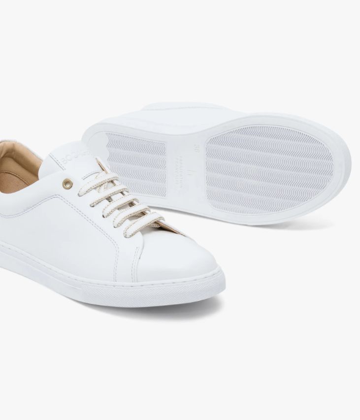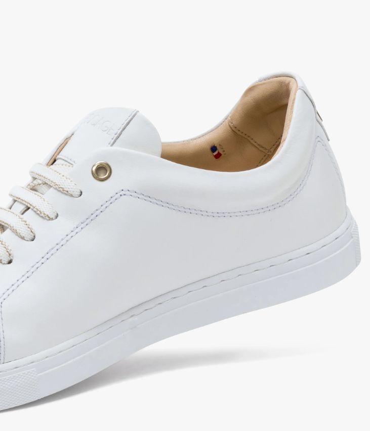 Une basket blanche en cuir lisse fabriquée avec soin dans notre propre atelier en France, au cœur du Maine et Loire (49). Une sneaker immaculée, illuminée par des deux œillets métalliques et un logo doré au talon, et fermée par des lacets plats incrustés de fil doré. Une chaussure entièrement doublée cuir avec semelle intérieure cuir amovible dotée d’une fine mousse recyclée. Elle est posée sur une semelle en caoutchouc blanc. Cette paire bénéficie du montage Strobel qui consiste à coudre directement la tige à la première de montage lors de la piqûre. Cette technique apporte une réelle robustesse et de la souplesse. La tige et la semelle sont renforcées grâce au cousu latéral. Ce cousu est un gage de qualité quant à sa fabrication et à sa durabilité. Languette et col moussés pour plus de confort.
