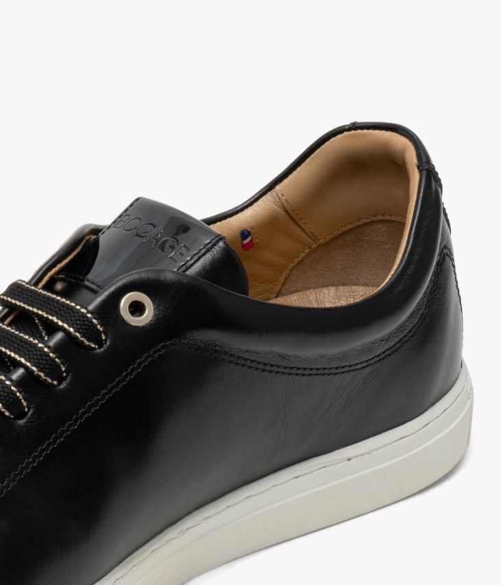 Une basket noire en cuir lisse fabriquée avec soin dans notre propre atelier en France, au cœur du Maine et Loire (49). Une sneaker au design épuré illuminée par des patchs vernis noirs sur la languette et au talon, fermée par des lacets plats incrustés de fil doré. Une chaussure entièrement doublée cuir avec semelle intérieure cuir amovible dotée d’une fine mousse. Elle est posée sur une semelle en caoutchouc blanc. Cette paire bénéficie du montage Strobel qui consiste à coudre directement la tige à la première de montage lors de la piqûre. Cette technique apporte une réelle robustesse et de la souplesse. La tige et la semelle sont renforcées grâce au cousu latéral. Ce cousu est un gage de qualité quant à sa fabrication et à sa durabilité. Languette et col moussés pour plus de confort.