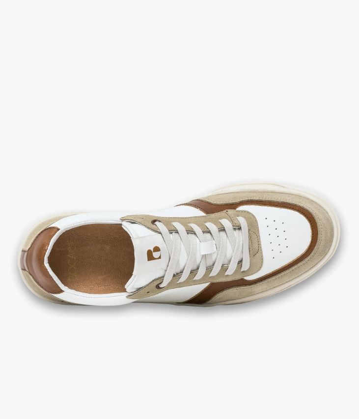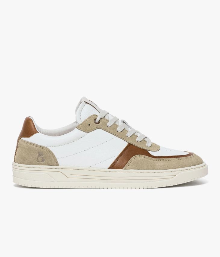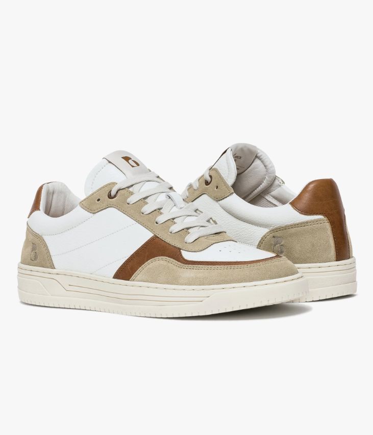 Une basket en cuir grainé blanc fabriquée avec soin au Portugal. Elle est agrémentée d’empiècements en cuir velours beige et en cuir lisse cognac. Des perforations et des surpiqûres lui confèrent une allure sportive. Une chaussure doublée textile avec semelle intérieure cuir amovible ultra confortable. Elle repose sur une épaisse semelle en caoutchouc ton sur ton. Cette paire bénéficie d’un cousu latéral qui consiste à relier la tige et la semelle, et d’un montage Strobel qui consiste à coudre directement la tige à la première de montage lors de la piqûre. Ces deux techniques apportent une réelle robustesse et souplesse au produit. Col et languette rembourrés pour plus de confort. Semelle 2,5 cm.
