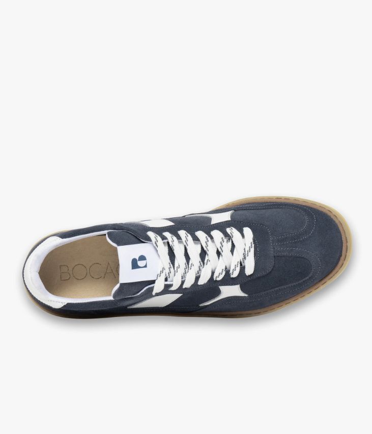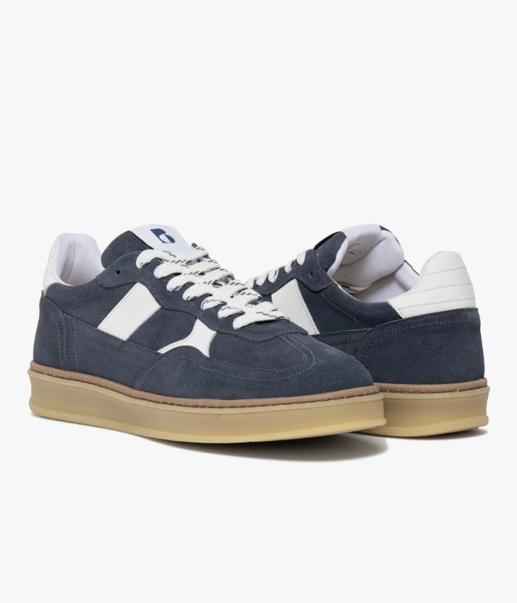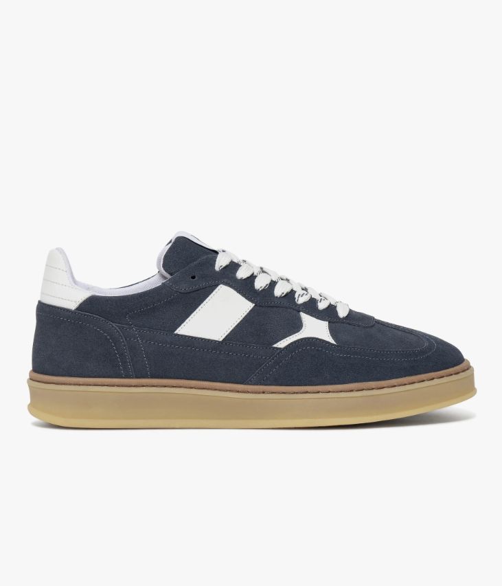 Une basket en cuir velours bleu fabriquée avec soin au Portugal. Un modèle d’inspiration rétro avec empiècement en T boostée par des touches de cuir blanc et des lacets bicolores. Une basket doublée textile avec semelle intérieure cuir moussée amovible. Elle repose sur une semelle miel avec trépointe contrastante. Cette paire bénéficie d’un cousu latéral qui consiste à relier la tige et la semelle. Cette technique apporte une réelle robustesse et souplesse au produit.