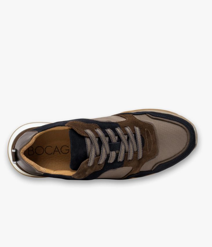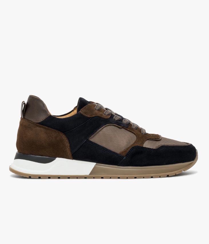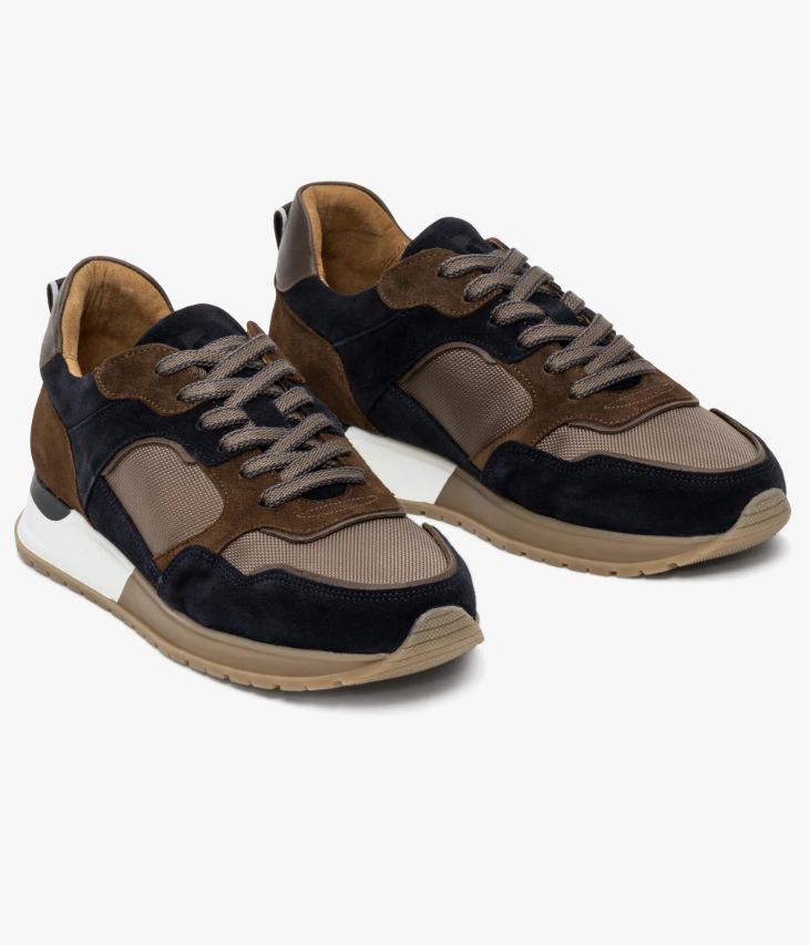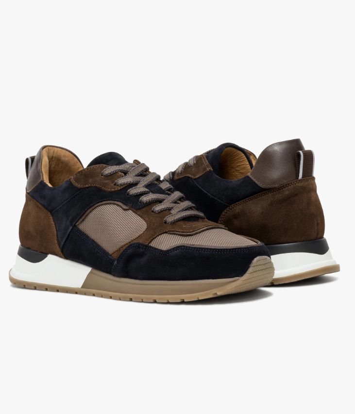 Une basket marine, chocolat et beige fabriquée avec soin au Portugal dans une alliance de cuir velours et de textile mesh. Son design est boosté par de nombreuses surpiqûres et empiècements, avec un patch en cuir lisse chocolat au talon et une tirette en nylon avec liserés phosphorescents. Une basket citadine entièrement doublée cuir avec semelle intérieure cuir amovible ultra confortable. Elle repose sur une semelle tricolore légèrement compensée avec couche d’usure crantée. Col et languette rembourrés pour plus de confort. Logo embossé sur la languette.