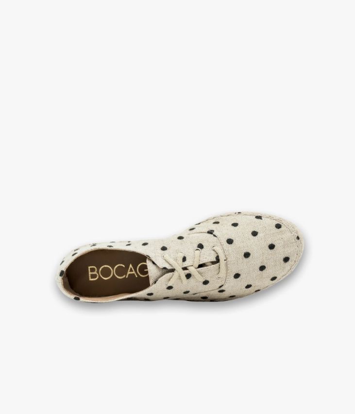 Une basket en toile beige à pois noirs fabriquée avec soin en Espagne. Un modèle enveloppant inspiré des espadrilles reposant sur une épaisse semelle en corde tressée. Elle se ferme à l’aide de lacets en corde coulissant dans des œillets métalliques. Une chaussure entièrement doublée cuir avec semelle intérieure cuir moussée. Semelle 3 cm.