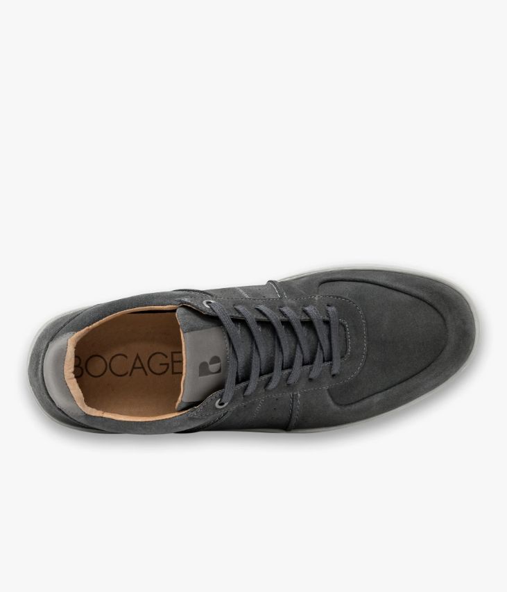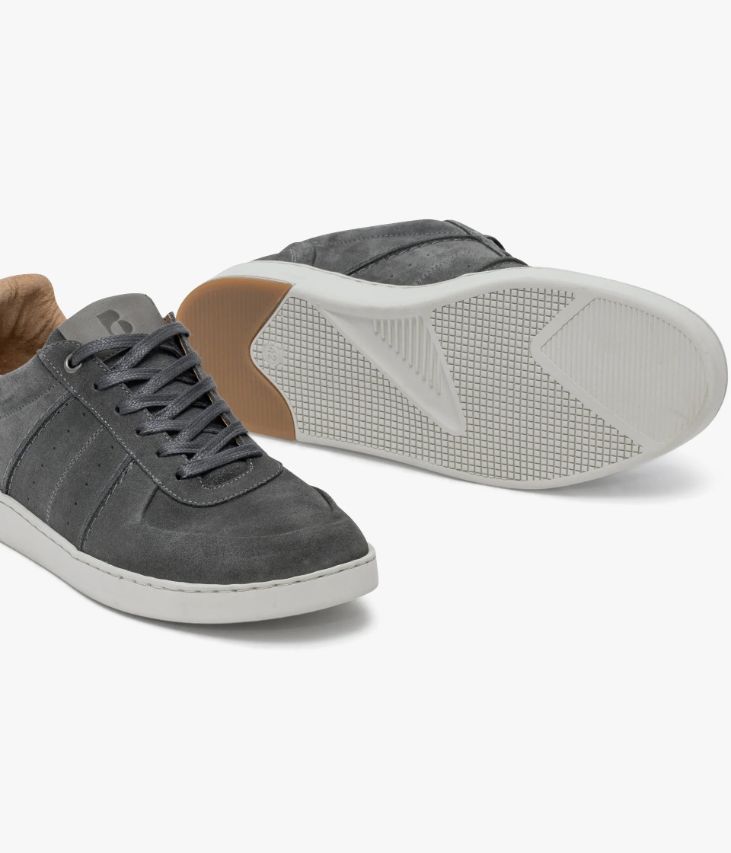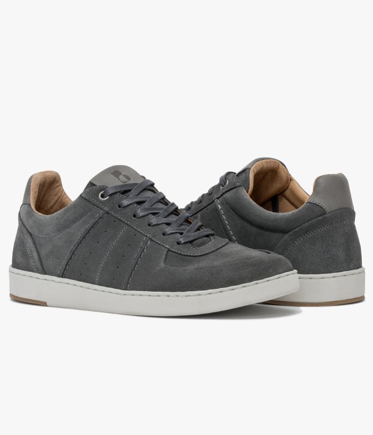 Une basket en cuir velours gris fabriquée avec soin au Portugal. Un modèle citadin à l’allure dynamique avec surpiqûres, perforations sur les côtés et empiècement avec coutures retournées sur le bout et le contrefort. Sur la languette et le talon des touches de cuir lisse ajoutent une touche de raffinement. Une basket homme partiellement doublée cuir avec semelle intérieure cuir moussée amovible. Elle repose sur une semelle blanche extra souple offrant un excellent confort de marche. Cette paire bénéficie du montage Strobel et d’une semelle renforcée par un cousu latéral, gage de qualité, apportant souplesse, robustesse et durabilité. Col et languette rembourrés.