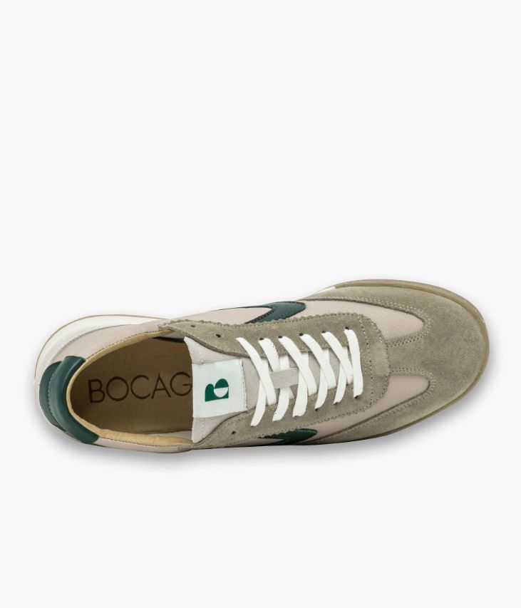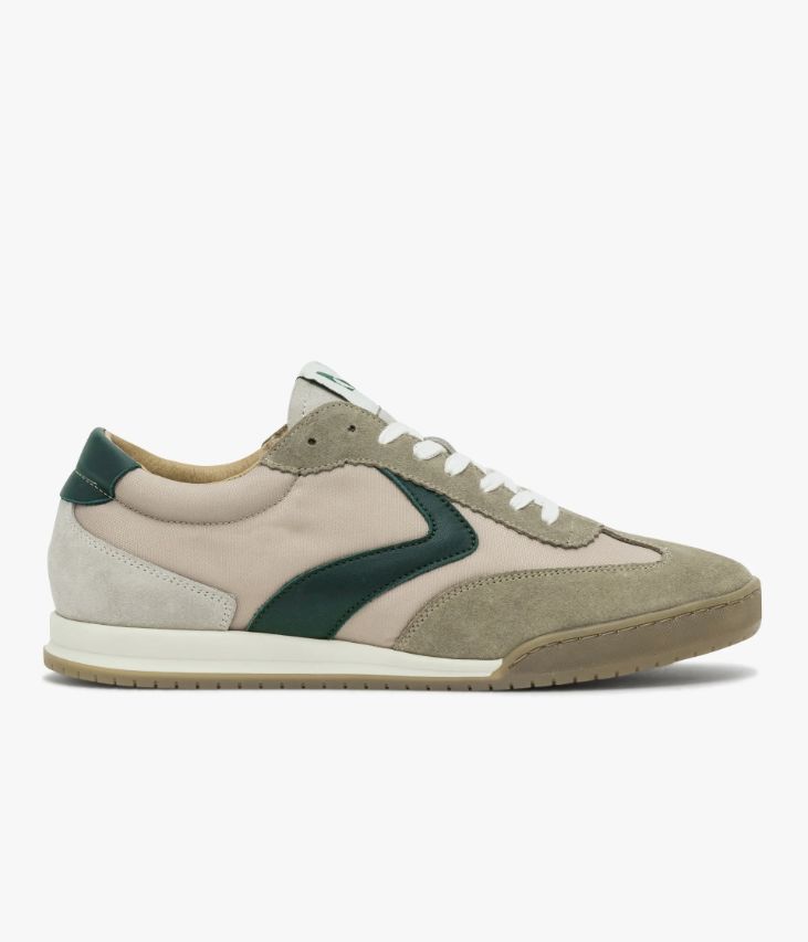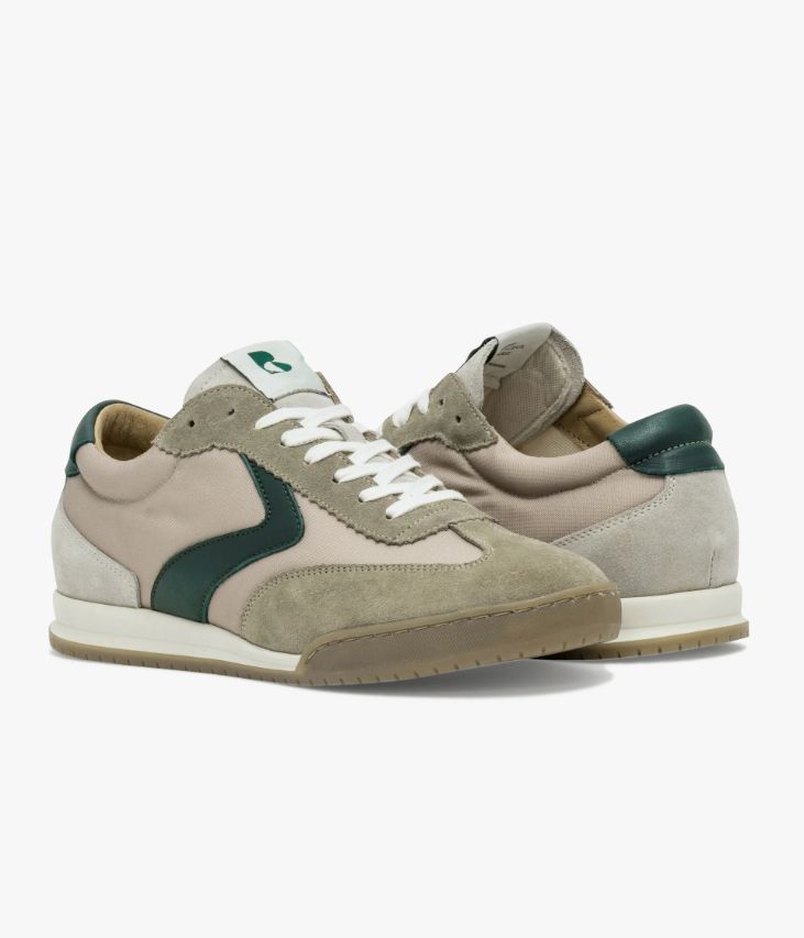 Une basket beige fabriquée avec soin au Portugal. Sa tige en toile nylon est agrémentée d’empiècements en cuir velours ton sur ton et écru, et rehaussée de touches de cuir lisse vert apportant une touche dynamique. Cette basket homme est doublée textile et dotée d’un col rembourré doublé cuir assurant un excellent confort. Elle repose sur une semelle bicolore renforcée par une piqûre latérale sur l’avant du pied.