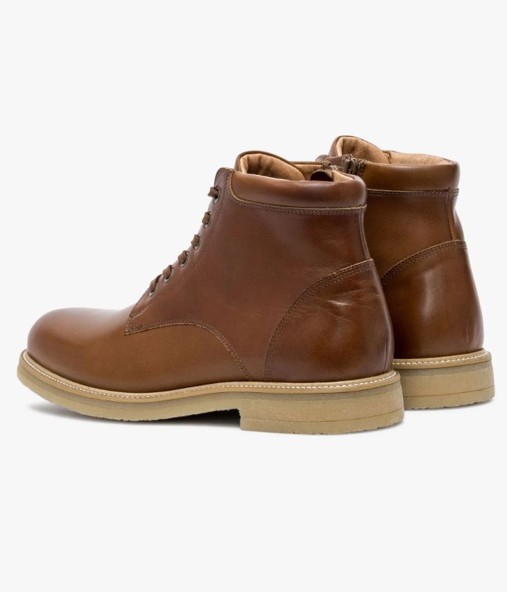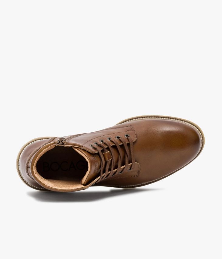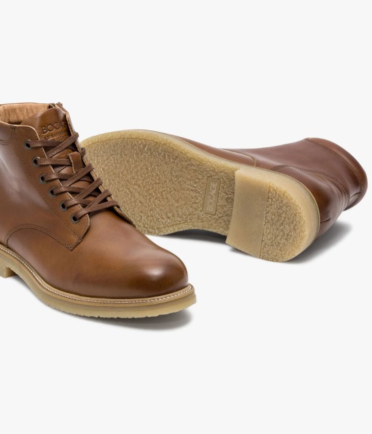 Un boots en cuir cognac fabriqué avec soin au Portugal. Un boots à lacets et zip intérieur au look authentique et rassurant posé sur une semelle aspect crêpe avec trépointe cuir piquée. Ce cuir pull-up est un cuir lisse à la couleur profonde obtenue par un tannage très particulier et des applications d'huiles et de cires en finition. Le col et la languette sont rembourrés pour offrir plus de confort. Une chaussure doublée textile et cuir avec semelle intérieure cuir moussée. Signature Bocage embossée sur la languette.