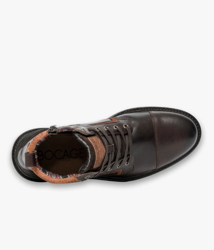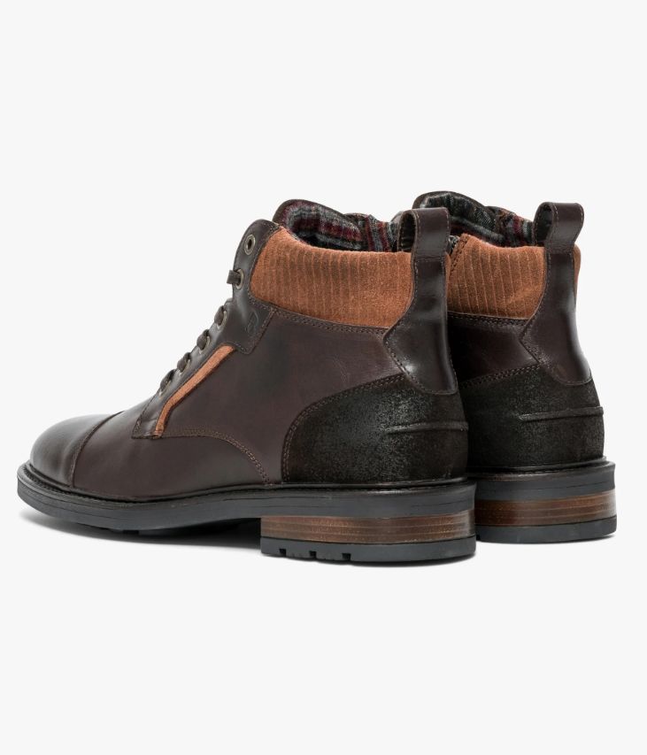 Un boots couleur café en cuir lisse fabriqué avec soin au Portugal. Il arbore un bout droit et un empiècement au talon en cuir velours à la finition brossée. Il est ponctué de touches cognac en cuir velours sur le col et les garants et en nubuck sur la languette. Un boots homme avec doublure chaude à motif tartan et semelle intérieure cuir moussée. Il s'ajuste à l'aide des lacets et se ferme facilement par zip intérieur. Il repose sur une semelle avec trépointe cuir piquée. Ce cuir pull-up est un cuir lisse à la couleur profonde obtenue par un tannage très particulier et des applications d'huiles et de cires en finition.