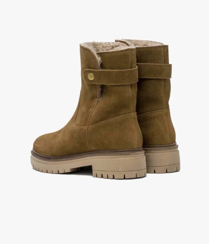 Un boots en cuir velours havane fabriqué avec le plus grand soin. Une bottine femme, doublée de textile bouclette au niveau de la tige, conçue pour affronter la saison automne-hiver avec style. Elle possède une bride avec bouton pression à l’arrière du pied et peut se porter de deux manières : tige haute ou tige retroussée pour laisser apparaitre la doublure. Ce boots possède une semelle intérieure cuir intégrant une fine couche de mousse et repose sur une épaisse semelle crantée avec trépointe cuir ciselée. Semelle 3 cm.