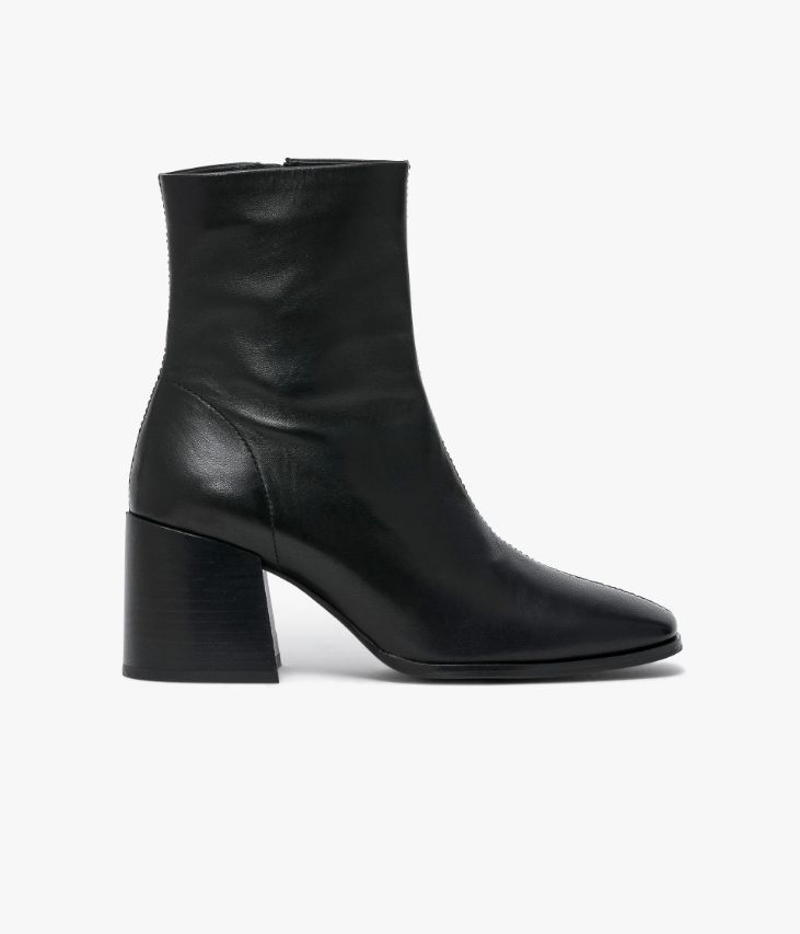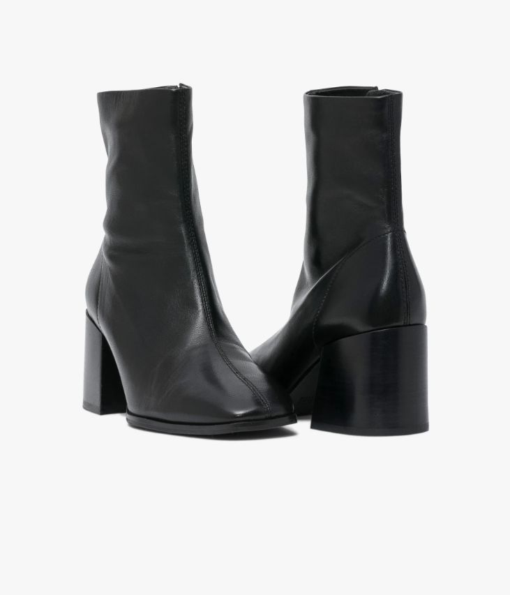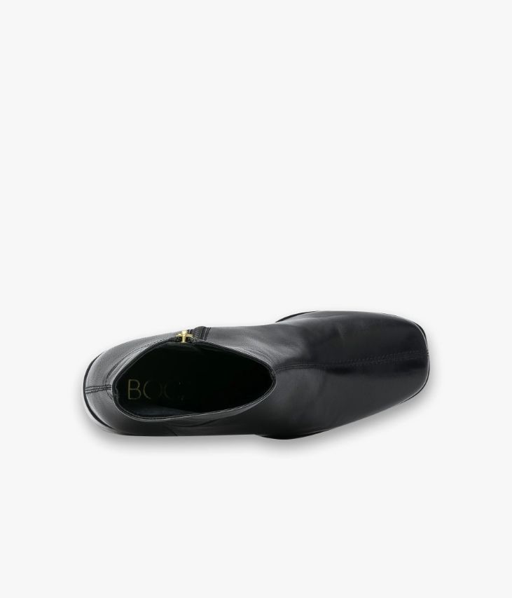 Un boot noir en cuir lisse au look à la fois sobre et audacieux inspiré du vestiaire des années 70 avec son bout carré et son talon imposant. Il est agrémenté d’une surpiqûre centrale et se ferme par zip intérieur. Sa tige non doublée offre un effet seconde peau chic et confortable. Cette chaussure possède la technologie brevetée Bocage Innovation, ainsi votre chaussure s'adaptera aux largeurs de votre pied et vous garantira un bien-être inédit. Un boots partiellement doublé cuir avec semelle intérieure cuir. Talon 7 cm. Tige 17 cm.