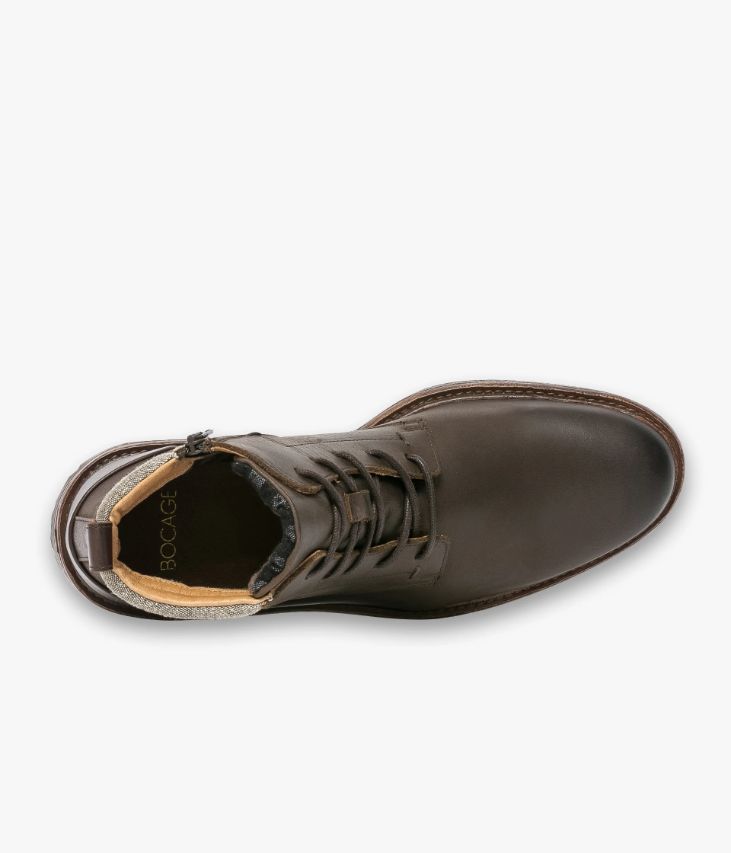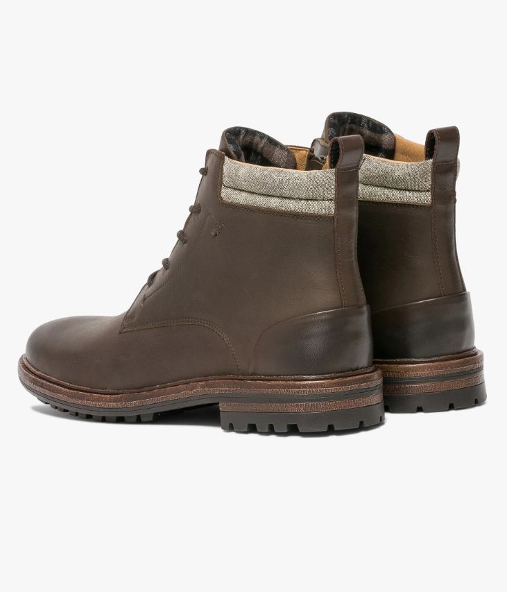 Unboots en cuir lisse marron fabriqué avec soin dans notre propre atelier auPortugal. Un boots en cuir gras souple et résistant, agrémenté d’unempiècement matelassé en tissu beige sur le haut de la tige. Sur le contrefort,une pièce de cuir avec couture retournée ajoute une touche de style. Cette bottinecitadine est entièrement doublée textile avec semelle intérieure cuir dotée d’unefine mousse. Elle repose sur une semelle en caoutchouc crantée, s’ajustepar lacets ronds et se ferme par zip intérieur.