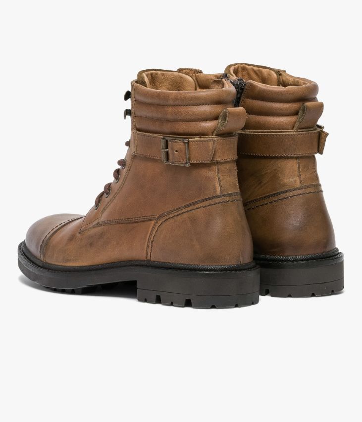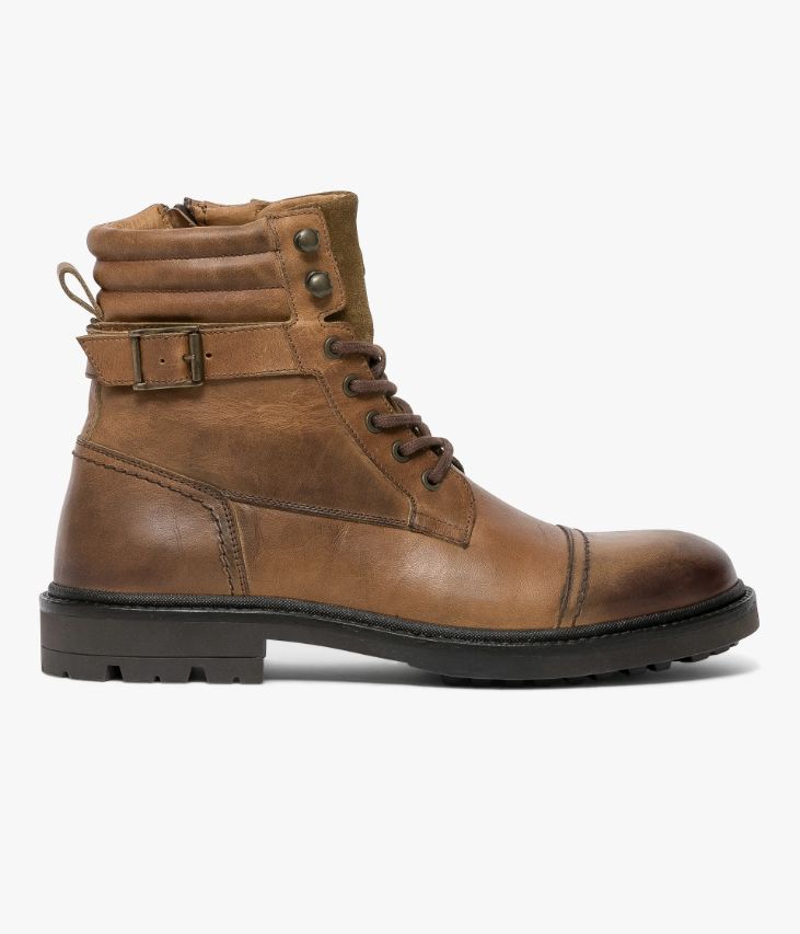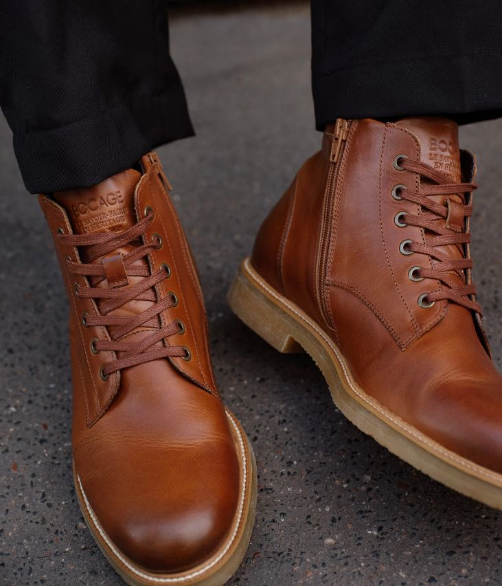 Un boots cognac en cuir lisse fabriqué avec soin au Portugal. Un boots citadin décontracté agrémenté d’empiècements surpiqués et d’une partie matelassée en haut de la tige. A la cheville, une bride ornée d’une boucle en métal vieilli ajoute une touche de style au modèle. Ce boots homme s’ajuste grâce à des lacets coulissant dans des œillets métalliques et se ferme à l’aide d’un zip intérieur. Il repose sur une semelle crantée avec trépointe cuir piquée. Une chaussure doublée cuir et textile avec semelle intérieure cuir. Languette en cuir velours avec logo embossé.