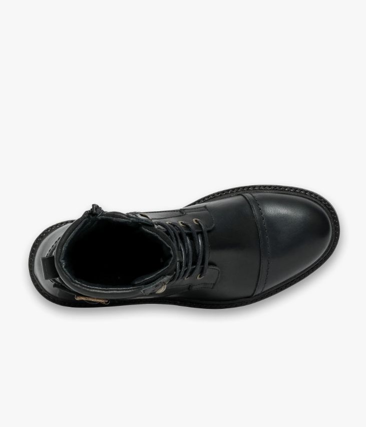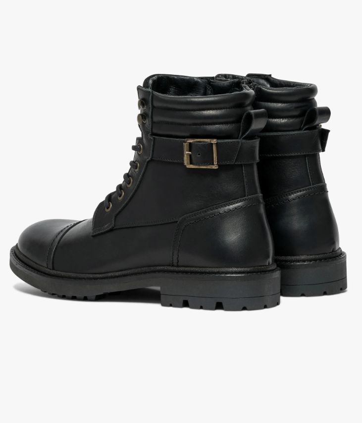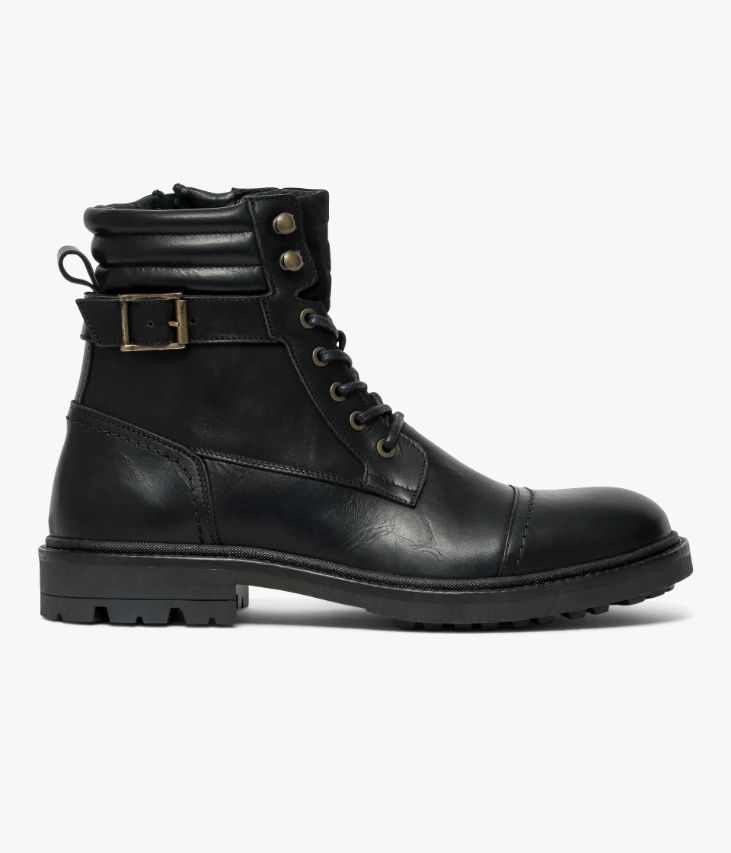 Un boots noir en cuir lisse fabriqué avec soin au Portugal. Un boots citadin décontracté agrémenté d’empiècements surpiqués et d’une partie matelassée en haut de la tige. A la cheville, une bride ornée d’une boucle en métal vieilli ajoute une touche de style au modèle. Ce boots homme s’ajuste grâce à des lacets coulissant dans des œillets métalliques et se ferme à l’aide d’un zip intérieur. Il repose sur une semelle crantée avec trépointe cuir piquée. Une chaussure doublée cuir et textile avec semelle intérieure cuir. Languette en cuir velours avec logo embossé.