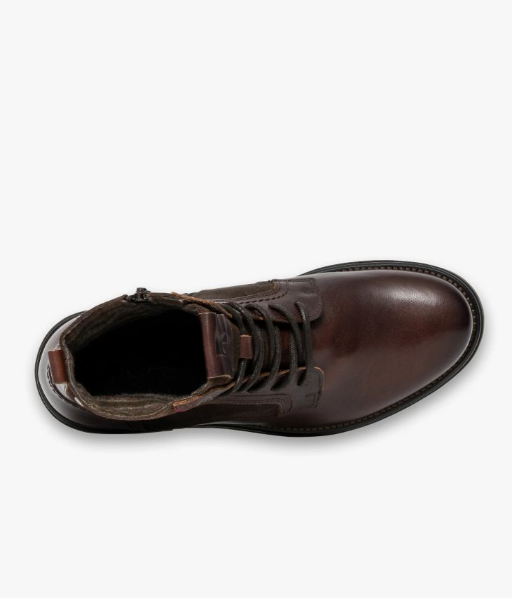Un boots en cuir couleur café fabriqué avec soin au Portugal. Composé d'un mix de cuir lisse et de cuir velours à la finition huilée, ce boots citadin arbore une allure authentique. Un style accentué par d'imposants lacets et une épaisse semelle crantée avec trépointe cuir débordante. Ce boots homme s'enfile facilement grâce à son zip intérieur. Doublé textile chaud à motif tartan, il possède une semelle intérieure cuir moussée très confortable.