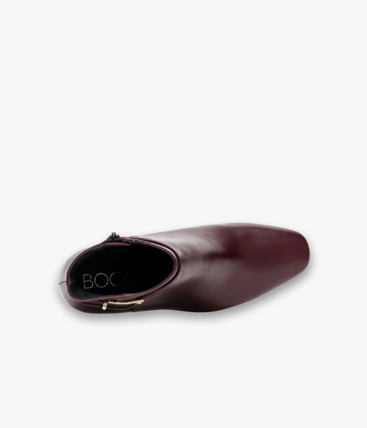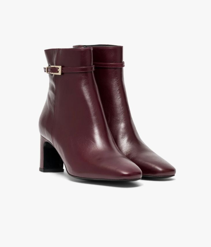 Un boots en cuir lie-de-vin fabriqué avec soin au Portugal. Ce modèle arbore une silhouette effilée avec bout carré ultra chic et une fine bride autour de la cheville, fermée par une élégante boucle dorée. Cette bottine repose sur une semelle fine et un talon à gorge enrobé à la fois féminin et très confortable au quotidien. Une chaussure entièrement doublée cuir avec semelle intérieure cuir très confortable. Elle se ferme facilement par un zip intérieur.