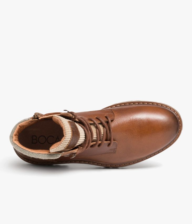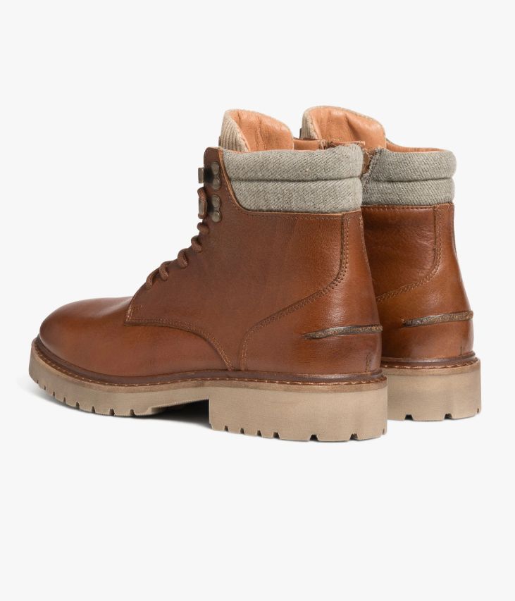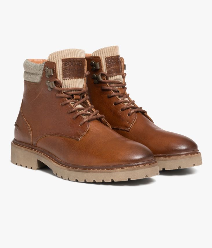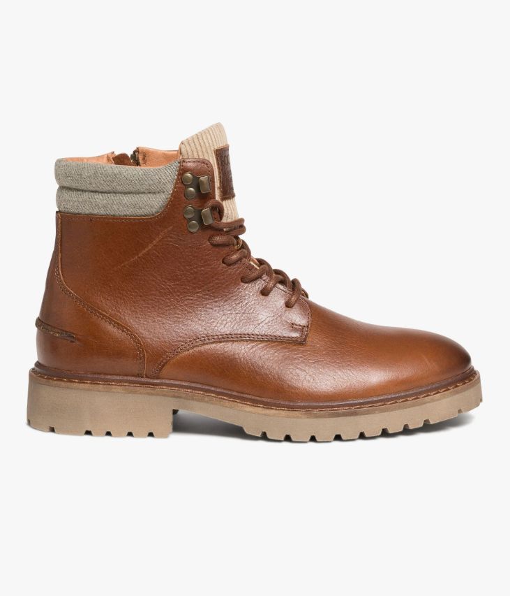 Un boots en cuir cognac fabriqué avec soin au Portugal. Un boots esprit Rangers au look robuste et rassurant, conçu en cuir pull-up foulonné, un cuir veiné à la couleur profonde obtenue par un tannage très particulier et des applications d'huiles et de cires en finition. Il est agrémenté d’un col en textile gris façon flanelle et d’une languette en velours côtelé beige. Un boots partiellement doublé cuir avec semelle intérieure cuir moussée. Il repose sur une semelle crantée en gomme aspect vieilli avec trépointe cuir piquée. Fermeture par lacets ronds et zip intérieur. Semelle 1,5 cm.