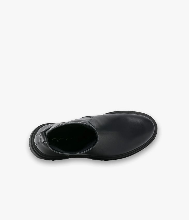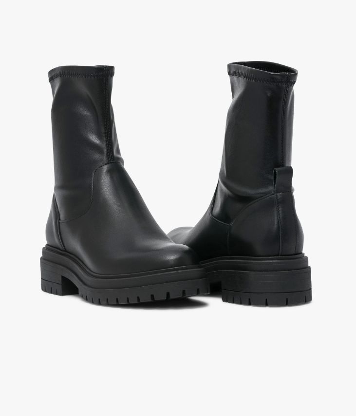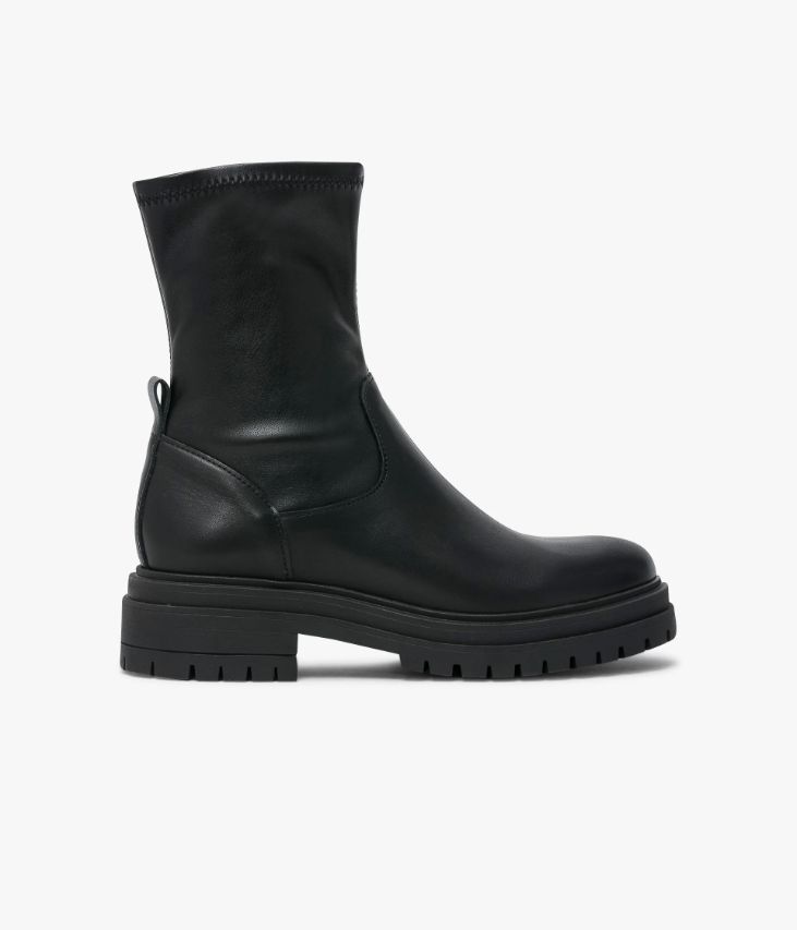 Un boots noir en cuir lisse fabriqué avec soin au Portugal. Ce boots femme surfe sur la tendance rock avec son dessus en cuir lisse, sa tige chaussette en textile synthétique et son imposante semelle crantée. Un boots confortable et facile à enfiler qui permet de trottiner toute la journée. A noter, sa tirette à l'arrière du pied qui facilite le chaussant. Boots partiellement doublé cuir avec semelle intérieure cuir. Semelle 3 cm.