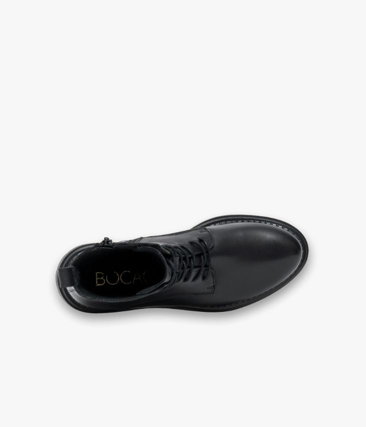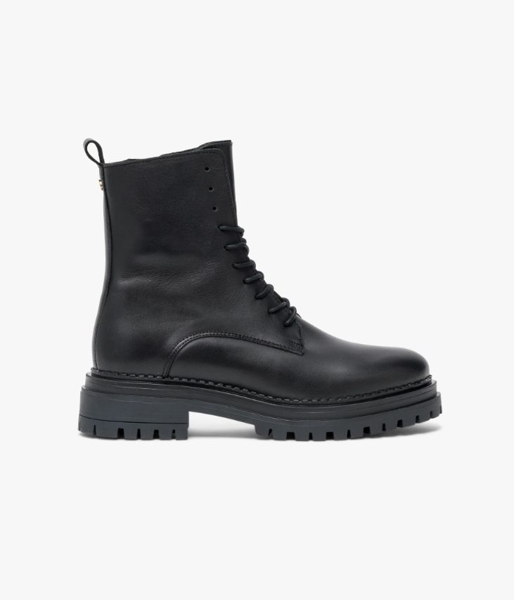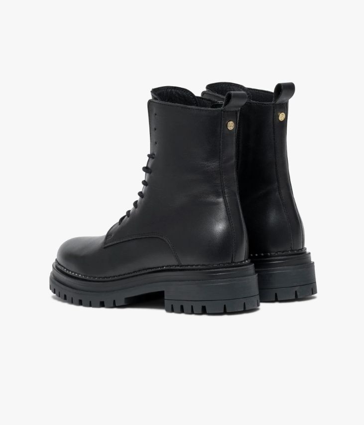 Un boots noir en cuir lisse, fortement inspiré de l’univers du rock avec sa ligne effilée et son épaisse semelle crantée rehaussée d'une trépointe fantaisie. Il possède un système de laçage pour s’ajuster à chaque morphologie et se ferme facilement par zip intérieur. A noter, sa tirette à l'arrière du pied qui facilite le chaussant. Une bottine femme doublée cuir avec semelle intérieure cuir. Semelle 3 cm.