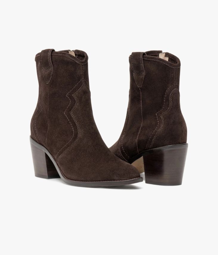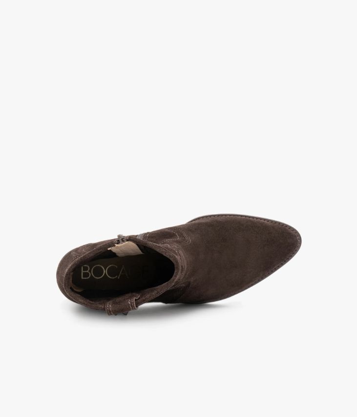 Un boots chocolat en cuir velours fabriqué avec le plus grand soin. Inspiré des bottes de cow-boys il arbore un bout pointu, de jolies surpiqûres en forme de flamme, une languette en haut de la tige et un talon en biseau. Doublé uniquement sur la partie pied, ce boots western s’ajuste parfaitement à la cheville en offrant une sensation seconde peau. Il possède une semelle intérieure cuir dotée d’une fine mousse. Notre technologie Bocage Innovation vous garantit un bien-être inégalé. La semelle dissimule des élastiques qui permettent à votre chaussure de s’adapter à votre pied. Fermeture par zip intérieur.