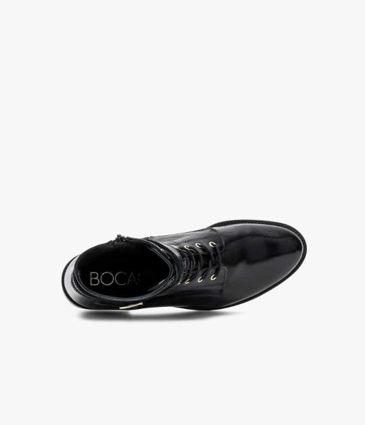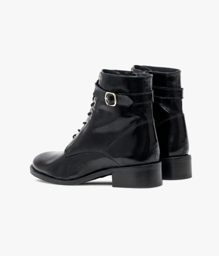 Un boots en cuir noir fabriqué avec soin au Portugal. Un modèle citadin particulièrement élégant orné d’une bride à boucle dorée en haut de la tige. Son cuir vintage est un cuir d'aspect vieilli qui se patine avec le temps, un cuir brillant qui affiche un aspect plus ou moins froissé, dont la tonalité peut varier, et qui peut avoir un aspect "déjà porté".Ce boots à bout amande possède une double fermeture par lacets coulissant dans des œillets dorés pour un ajustement parfait et par zip intérieur pour un enfilage facile. Il repose sur une semelle légèrement débordante avec trépointe cuir piquée. Notre technologie Bocage Innovation vous garantit un bien-être inégalé. La semelle dissimule des élastiques qui permettent à votre chaussure de s’adapter à votre pied. Une chaussure entièrement doublée cuir avec semelle intérieure cuir dotée d’une fine mousse.