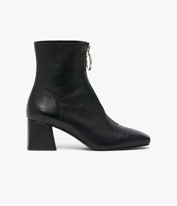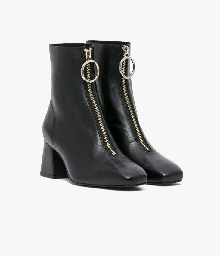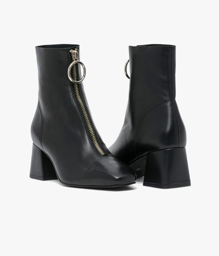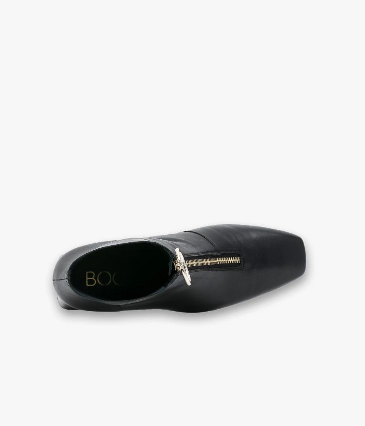 Boots noir en cuir lisse avec zip sur l'avant. Un boots noir original et ultra élégant avec son bout carré, son talon en talus et son zip de fermeture avec boucle en métal doré sur le dessus du pied. Un boots à la ligne effilée avec une tige ajustée à la cheville et non doublée pour un effet seconde peau. Cette chaussure possède la technologie brevetée Bocage Innovation, ainsi votre chaussure s'adaptera aux largeurs de votre pied et vous garantira un bien-être inédit. Boots doublé sur la partie pied avec semelle intérieure cuir. Talon recouvert 6 cm. Tige 15 cm. On l'associe avec un tailleur pantalon et un sac en cuir noir.