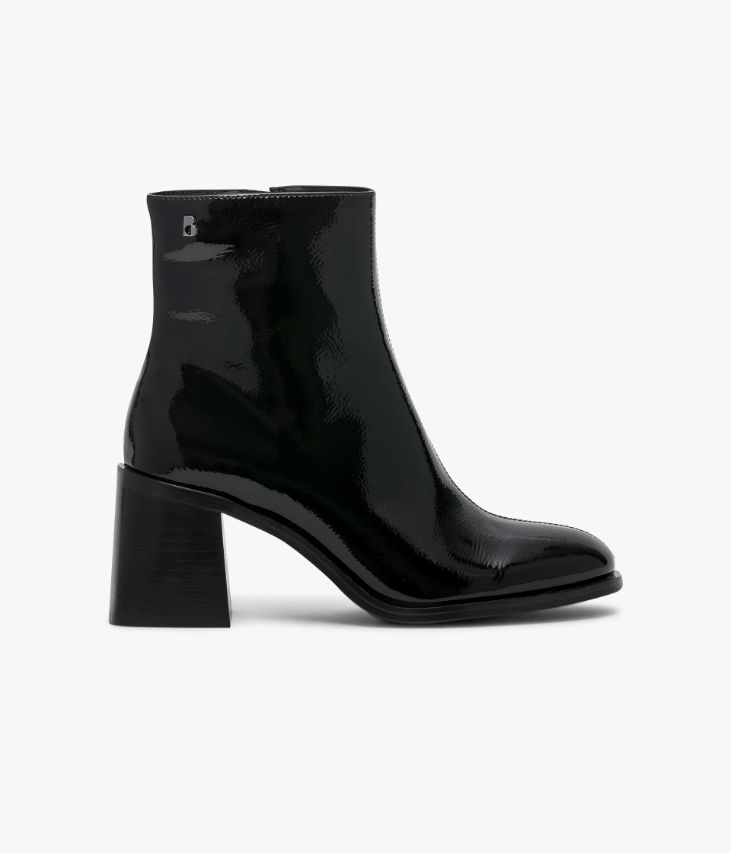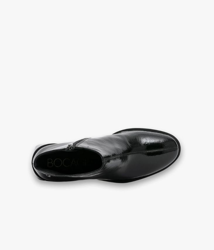 Un boots en cuir verni noir fabriqué avec le plus grand soin. Une bottine ultra féminine avec tige effilée, bout amande et surpiqûre sur le dessus. Ce modèle au look épuré est juste décoré d’un logo métallique sur le haut de la tige. Ce boots femme repose sur une semelle avec trépointe débordante et un large talon lamellé collé. Notre technologie Bocage Innovation vous garantit un bien-être inégalé. La semelle dissimule des élastiques qui permettent à votre chaussure de s’adapter à votre pied. Une chaussure entièrement doublée cuir avec semelle intérieure cuir moussée. Ce cuir Naplak particulièrement souple peut présenter un aspect légèrement froissé.