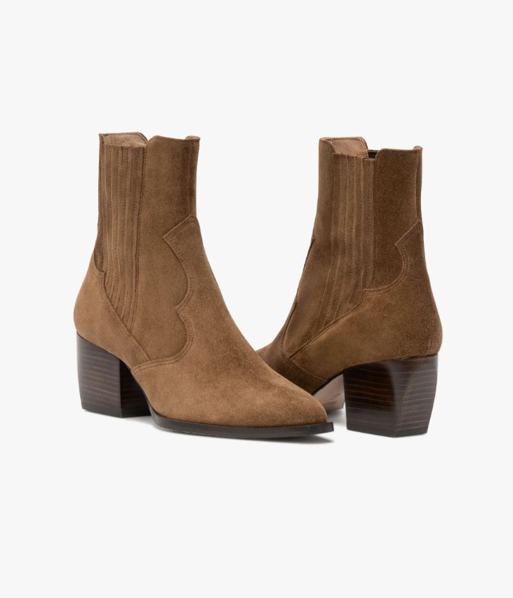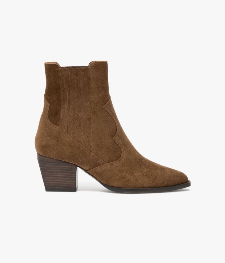Un Chelsea boots en cuir velours couleur havane fabriqué avec soin dans notre propre atelier en France, au cœur du Maine et Loire (49). Ce boots Santiag mixe les codes western à des accents folk tout en conservant une allure féminine avec son bout pointu posé sur une trépointe débordante carrée, ses découpes en forme de flamme et son talon à facettes en biseau. Ce boots femme s'enfile facilement grâce à ses élastiques latéraux recouverts de fines bandes de cuir. Une chaussure doublée cuir avec semelle intérieure cuir dotée d'une fine mousse.