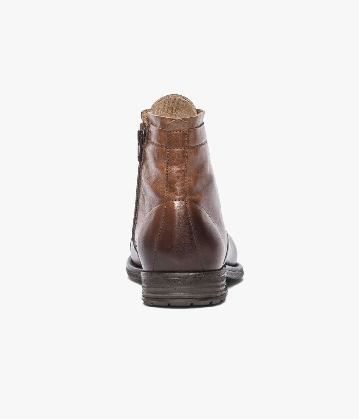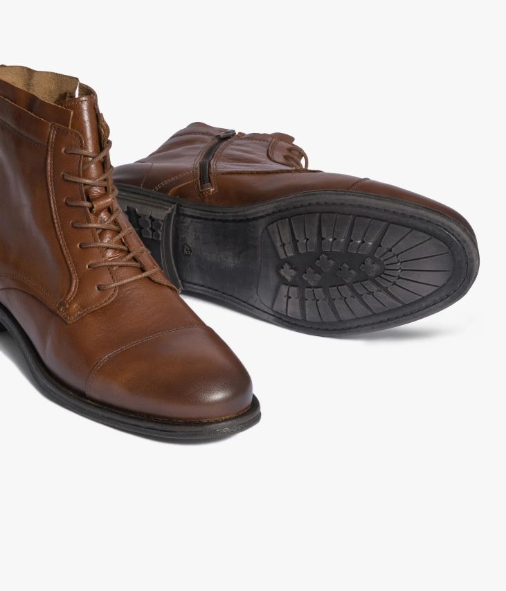 Boots cognac en cuir lisse avec quartiers surpiqués. Un boots cognac en cuir lisse original avec son bout et son talon légèrement patinés. Un boots à bout droit avec de nombreuses surpiqûres et des points sellier sur les quartiers. Il possède un double système de fermeture, par lacets pour un ajustement parfait, et par zip intérieur pour plus de simplicité. Une chaussure montante doublée textile sur le bout du pied avec semelle intérieure cuir. Elle est posée sur une semelle en caoutchouc à l’aspect légèrement usé. Tige 13 cm. Talon 2 cm. Ce boots apporte une touche casual à tous les looks.