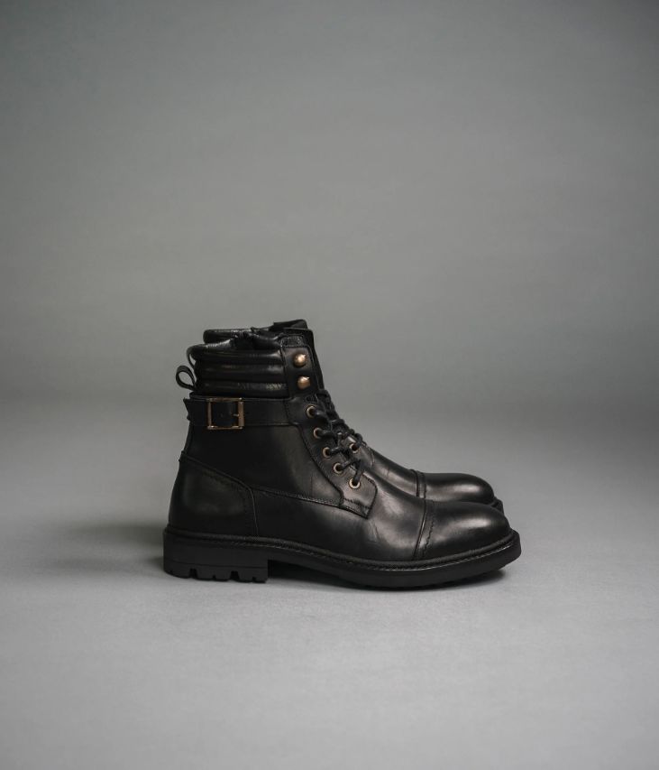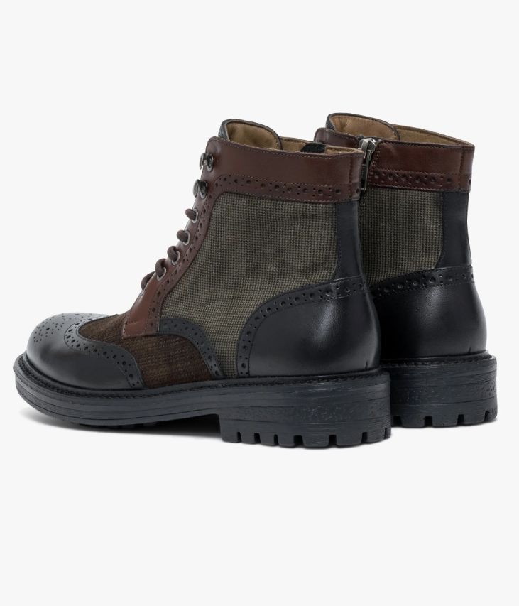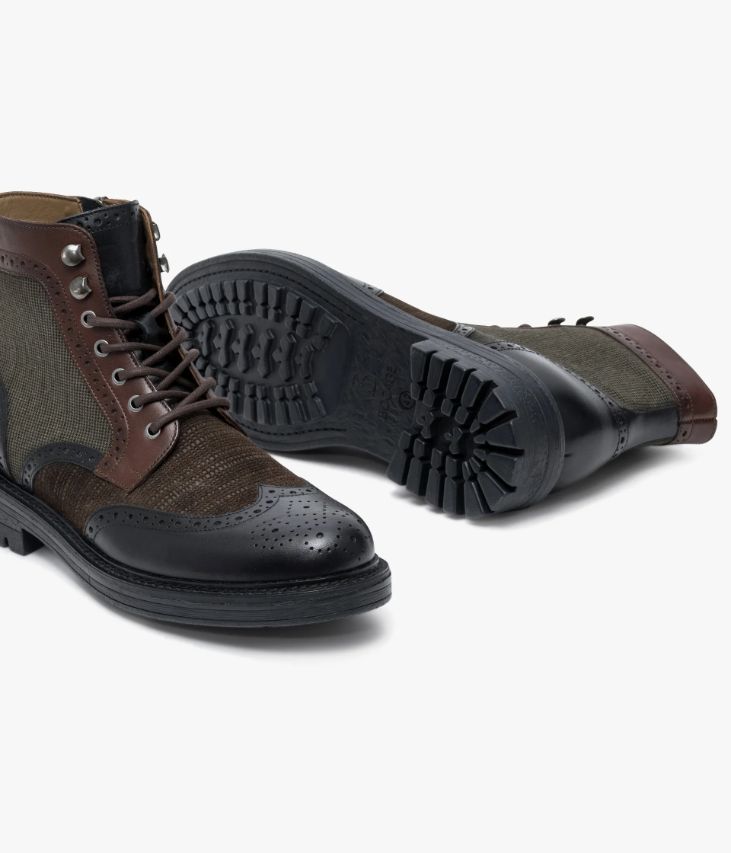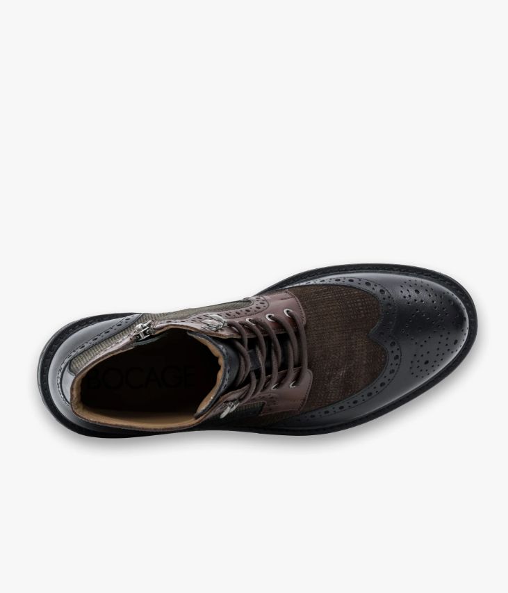 Un boots en cuir noir et chocolat fabriqué avec le plus grand soin. Il mixe audacieusement des empiècements en cuir lisse noir et châtaigne ornés d’élégantes perforations, du cuir velours embossé chocolat et du textile à motif pied-de-poule. Ce boots citadin possède un double système de fermeture par lacets coulissant dans des œillets et des crochets et par zip intérieur. Une chaussure entièrement doublée cuir avec semelle intérieure cuir moussée. Elle repose sur une semelle crantée légère avec trépointe cuir piquée. Semelle 2 cm.