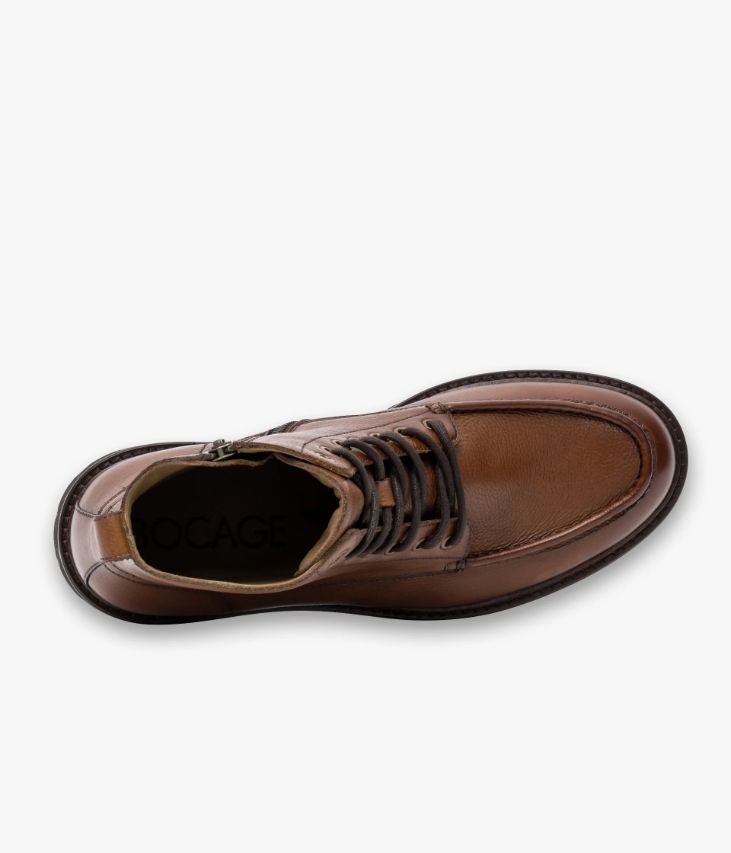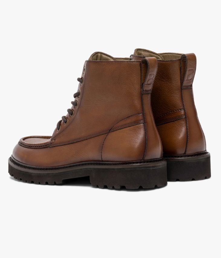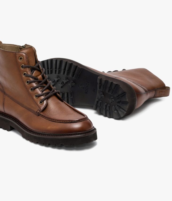 Un boots en cuir cognac fabriqué avec le plus grand soin. Un modèle en cuir grainé, avec couture en relief sur le plateau et surpiqûres fantaisie sur les quartiers, doté d’un empiècement avec tirette à l’arrière du pied. Il repose sur une semelle crantée ultra légère avec double trépointe cuir. Ce boots homme possède une double fermeture par lacets rond pour un ajustement parfait et par zip intérieur pour plus de simplicité. Une chaussure entièrement doublée cuir avec semelle intérieure cuir moussée. Semelle 2 cm.