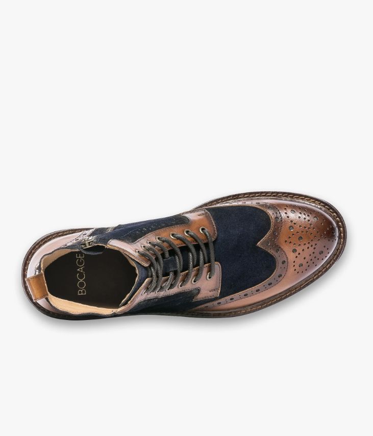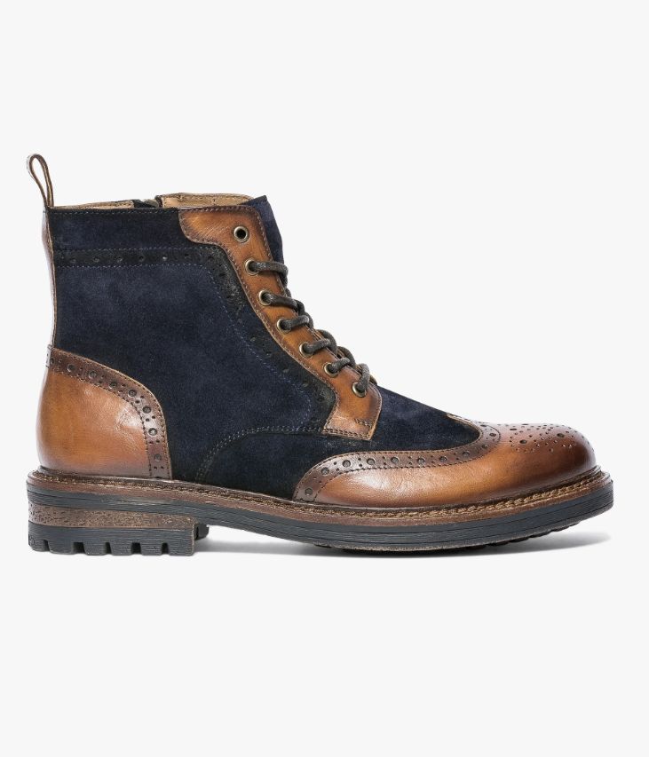 Boots en cuir velours marine et cuir lisse cognac. Ce boots en cuir velours marine affiche un design atypique inspiré du derby avec son bout fleuri et son talon en cuir lisse cognac. On retrouve également des touches de cuir lisse sur les garants et sur la tirette à l’arrière de la tige. Un boots aussi confortable que stylé qui s’ajuste à chaque pied grâce à des lacets ronds et qui se ferme facilement par zip intérieur. Il repose sur une épaisse semelle avec trépointe cuir et couche d’usure crantée. Semelle 2 cm. Talon 3,5 cm. Boots homme entièrement doublé cuir avec semelle intérieure cuir. Un boots à porter avec un jean retroussé et une veste marine.