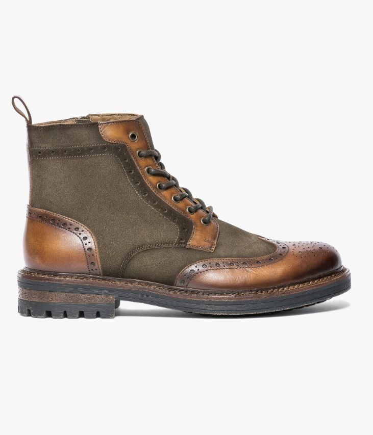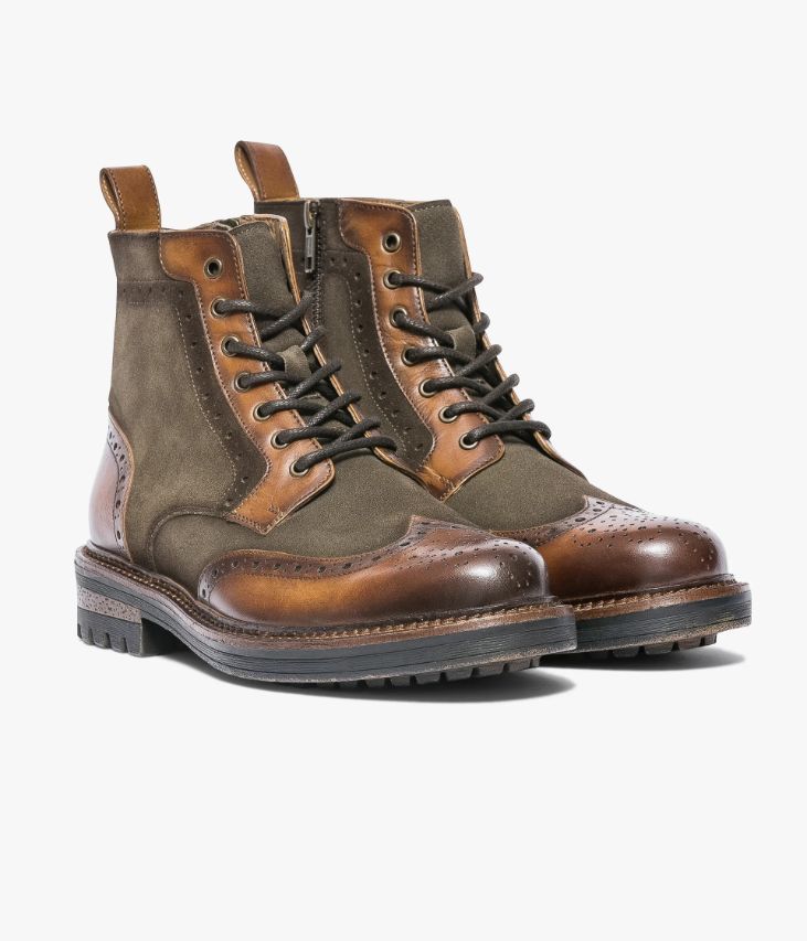 Boots en cuir velours kaki et cuir lisse cognac. Ce boots en cuir velours kaki affiche un design atypique inspiré du derby avec son bout fleuri et son talon en cuir lisse cognac. On retrouve également des touches de cuir lisse sur les garants et sur la tirette à l’arrière de la tige. Un boots aussi confortable que stylé qui s’ajuste à chaque pied grâce à des lacets ronds et qui se ferme facilement par zip intérieur. Il repose sur une épaisse semelle avec trépointe cuir et couche d’usure crantée. Semelle 2 cm. Talon 3,5 cm. Boots homme entièrement doublé cuir avec semelle intérieure cuir. Un boots à porter avec un jean retroussé et un pull kaki.