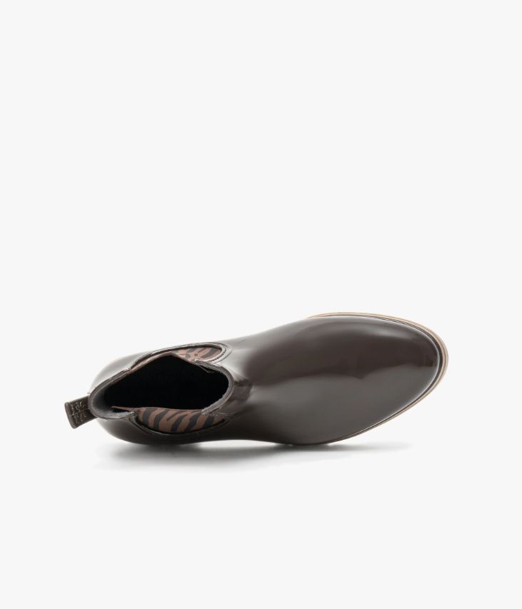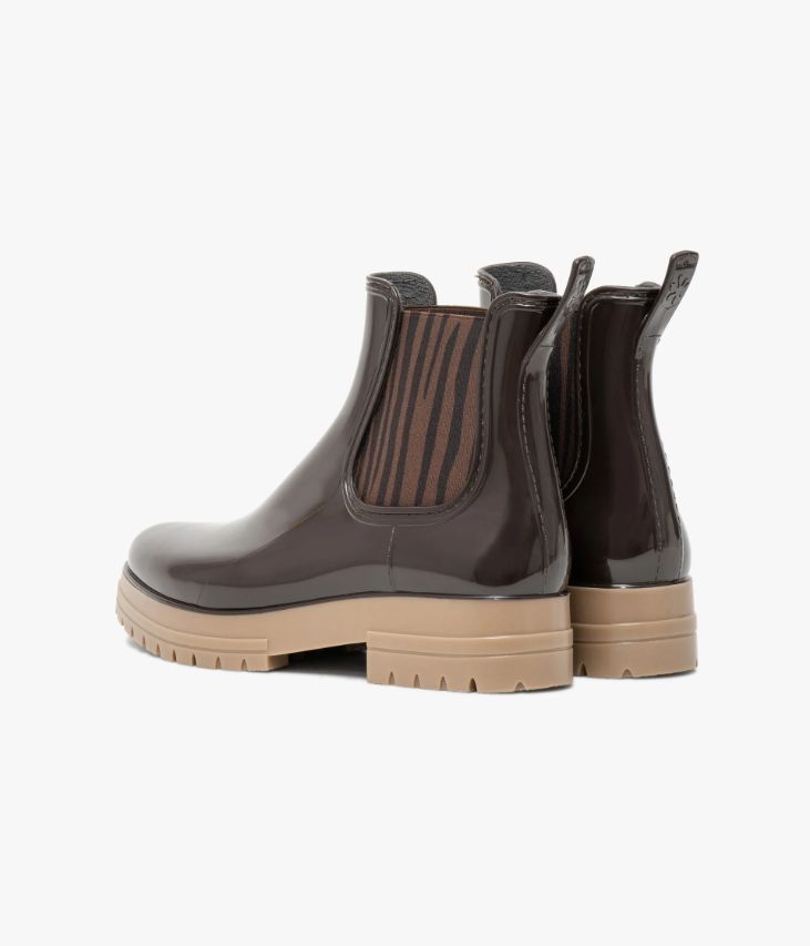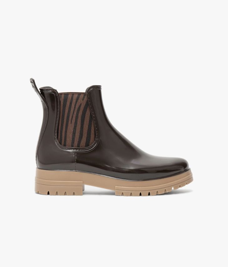 Un boots chocolat confectionné avec soin dans notre propre atelier en France, au cœur du Maine et Loire (49). Une bottine de pluie élégante à bout amande, inspirée du Chelsea, rehaussée de larges élastiques latéraux à motifs zébrés. Ce boots repose sur une épaisse semelle couleur miel dissimulant des crampons. Une tirette au talon facilite l’insertion du pied. Semelle 2,5 cm.