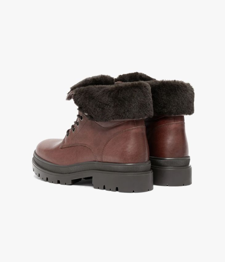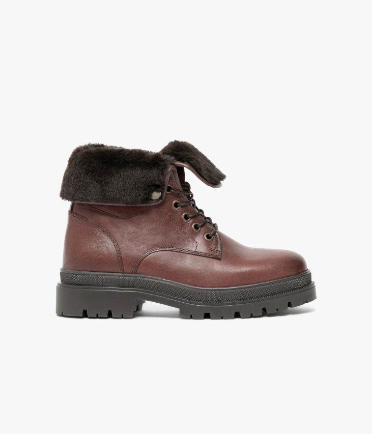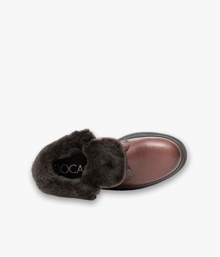 Un boots en cuir cognac fabriqué avec soin dans notre atelier au Portugal, affichant un effet patiné sur le bout et au talon. Un boots confortable avec doublure chaude en textile et semelle intérieure cuir moussée. Le col souple et la languette sont doublés de fausse fourrure et peuvent se porter retroussés pour ajouter une note cocooning à vos looks. Ce boots repose sur une épaisse semelle crantée avec trépointe ciselée. Semelle 3 cm.