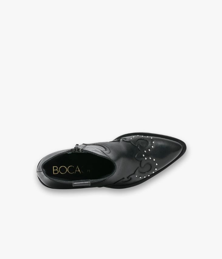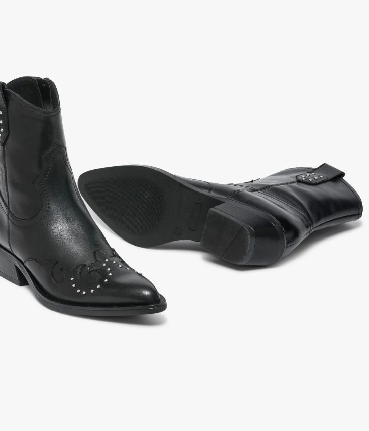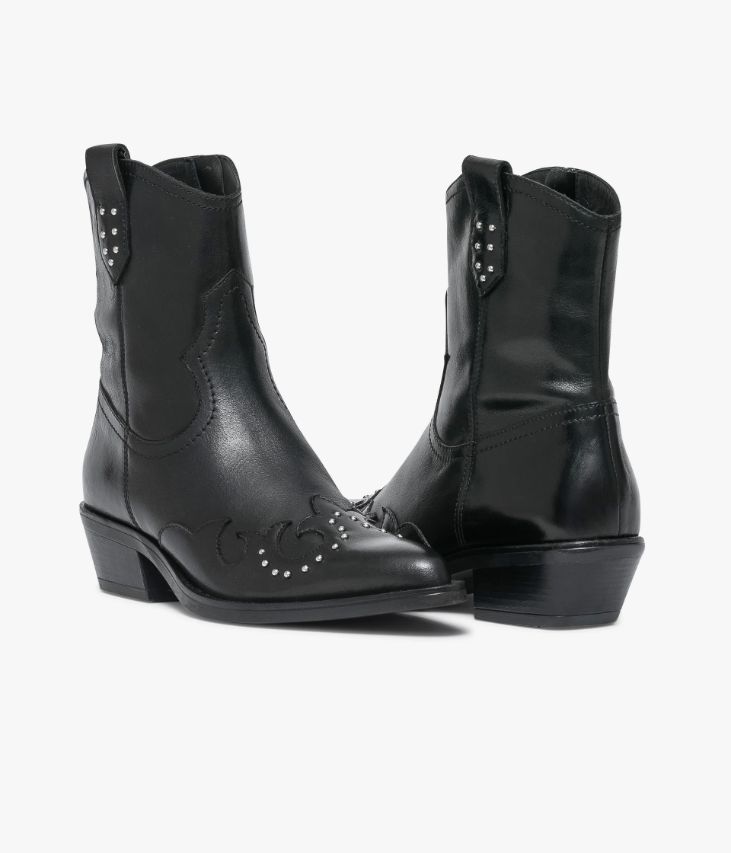 Un boots en cuir noir fabriqué avec le plus grand soin. Une bottine western réalisée en cuir glacé aux reflets brillants, agrémentée d’empiècements en forme de flamme et décorée de petits clous métalliques. Inspirée des bottes de cow-boys, elle arbore une ligne effilée, un bout pointu, une tirette en haut de la tige et un talon en biseau. Un boots femme entièrement doublé cuir avec semelle intérieure cuir dotée d’une fine mousse. Elle se ferme facilement par zip intérieur.