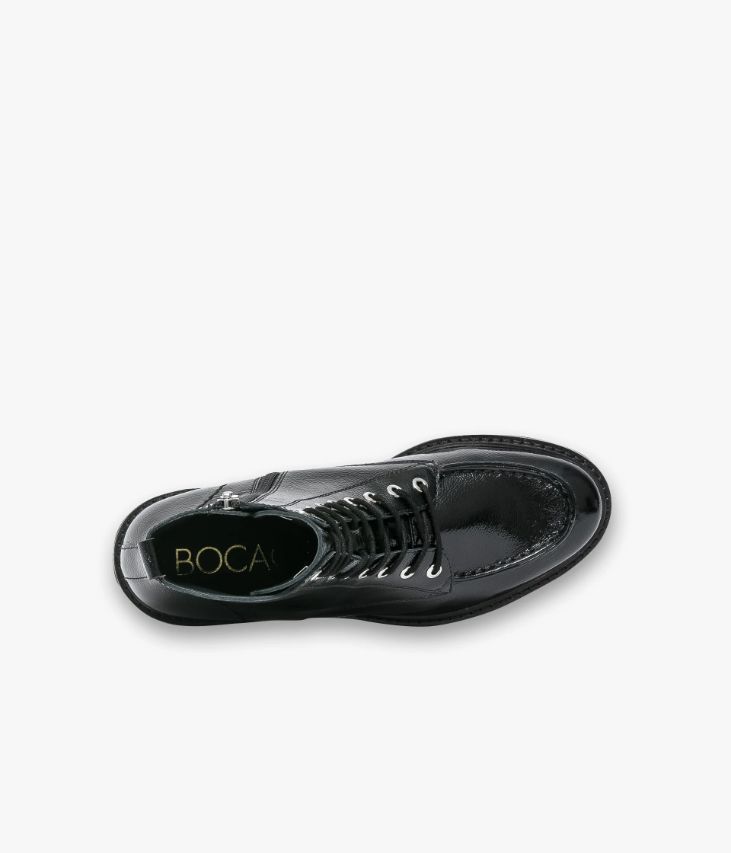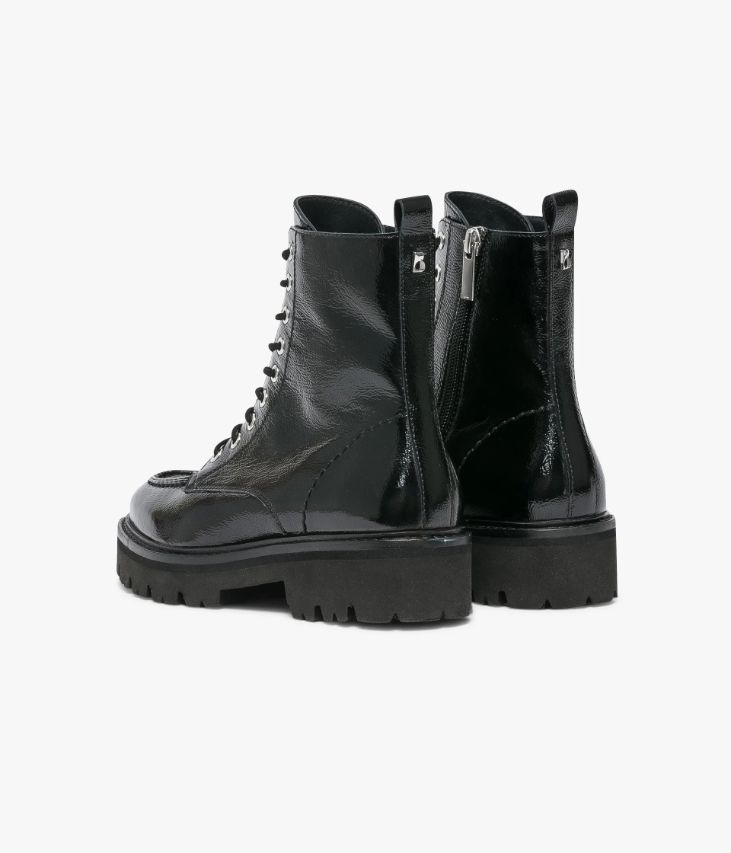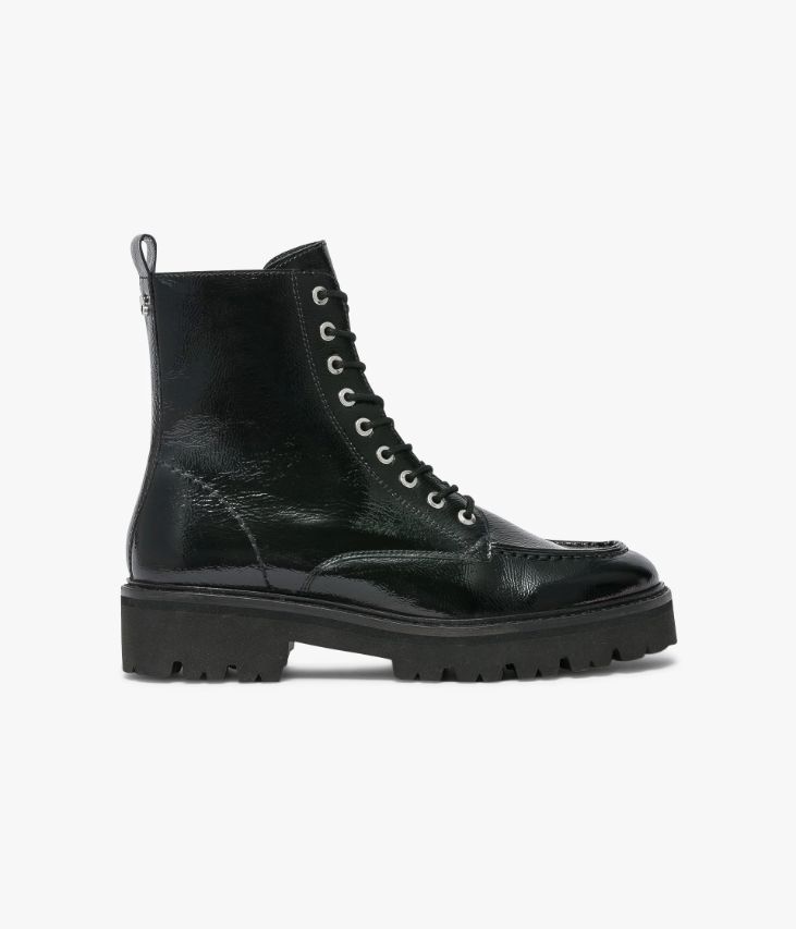 Un boots noir en cuir verni fabriqué avec le plus grand soin. Un boots femme ultra tendance, avec sa tige effilée rehaussée d’une couture en relief sur le dessus et son épaisse semelle crantée. Il possède un système de laçage avec œillets métalliques pour s’ajuster à chaque morphologie et se ferme facilement par zip intérieur. Une tirette à l'arrière du pied qui facilite le chaussant. Une bottine entièrement doublée cuir avec semelle intérieure cuir. Semelle extra légère 3 cm.
